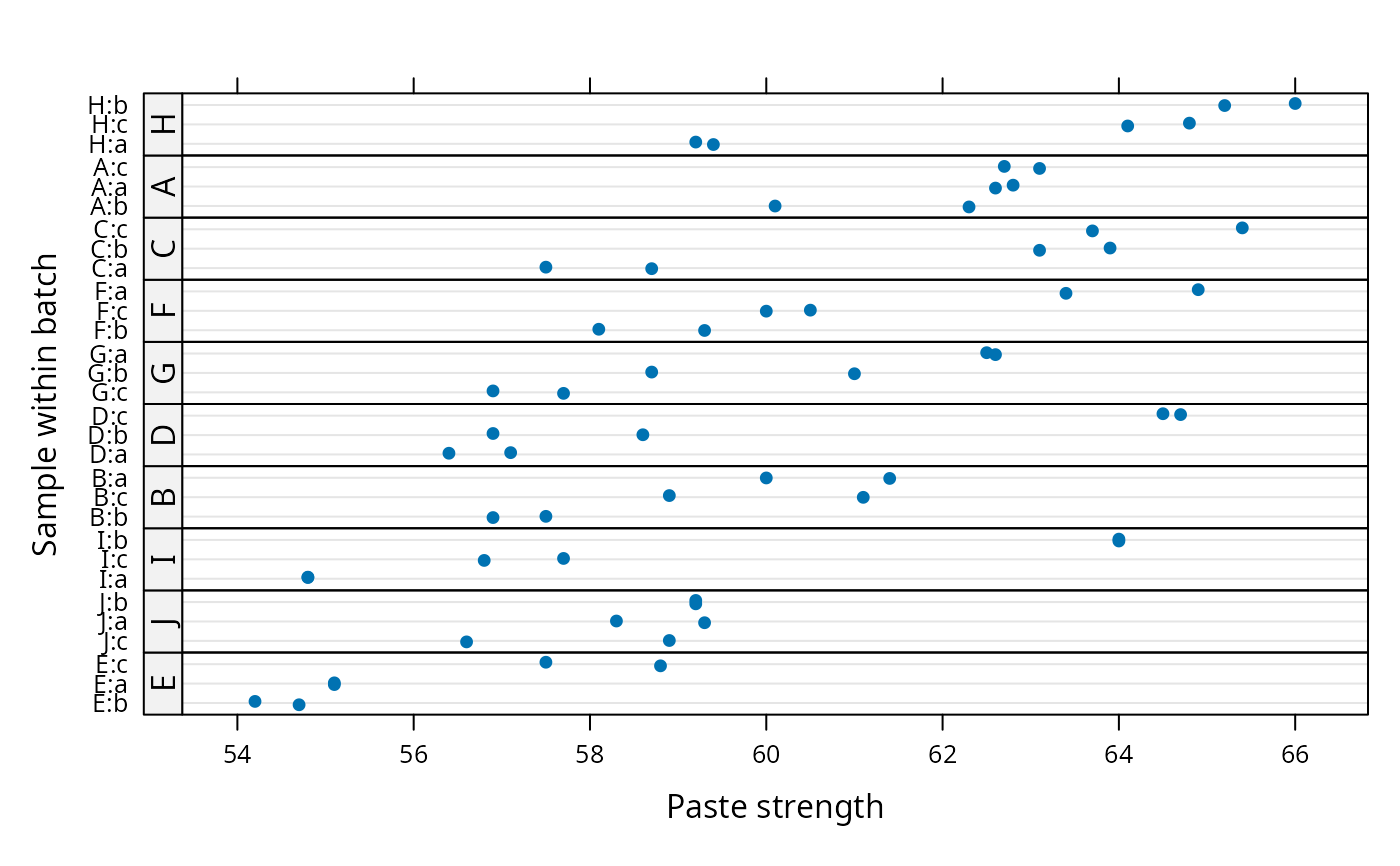 #> $ batch : Factor w/ 10 levels "A","B","C","D",..: 1 1 1 1 1 1 2 2 2 2 ...