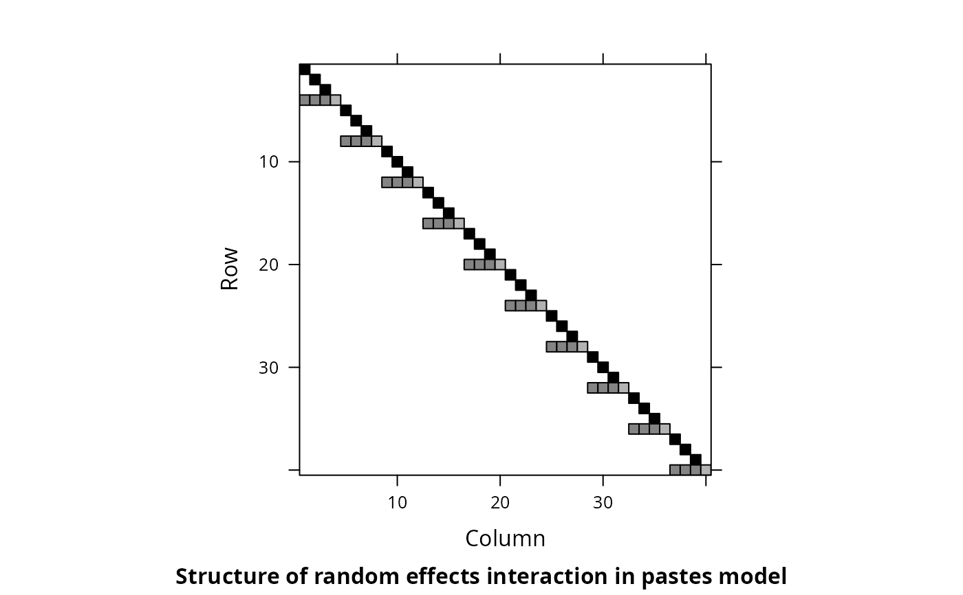 Matrix::image(L, sub = "Structure of random effects interaction in pastes model")