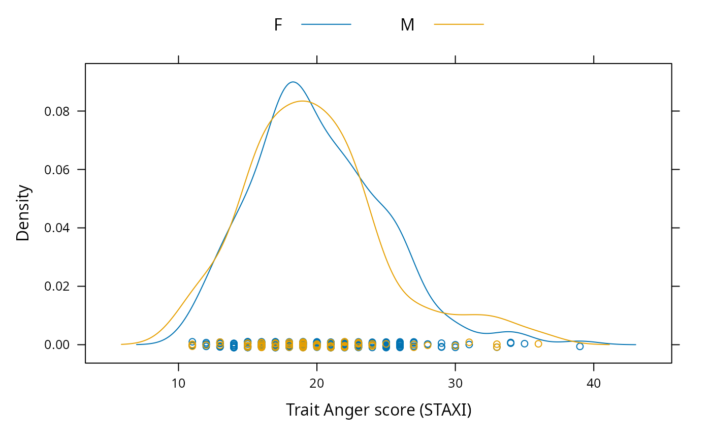densityplot(~ Anger, person, groups = Gender, auto.key = list(columns = 2),