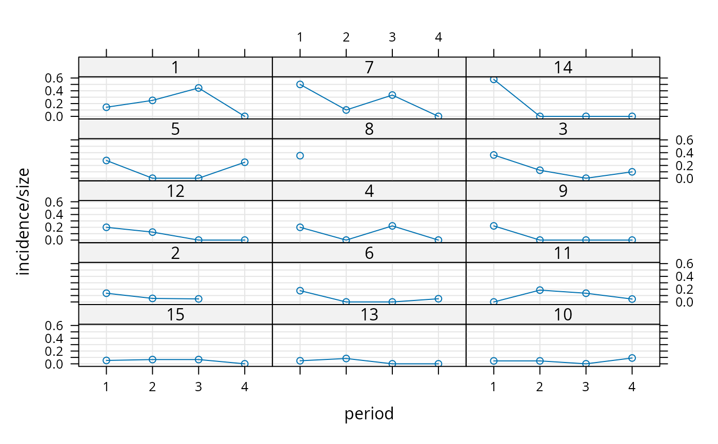 xyplot(incidence/size ~ period|herd, cbpp, type=c('g','p','l'),