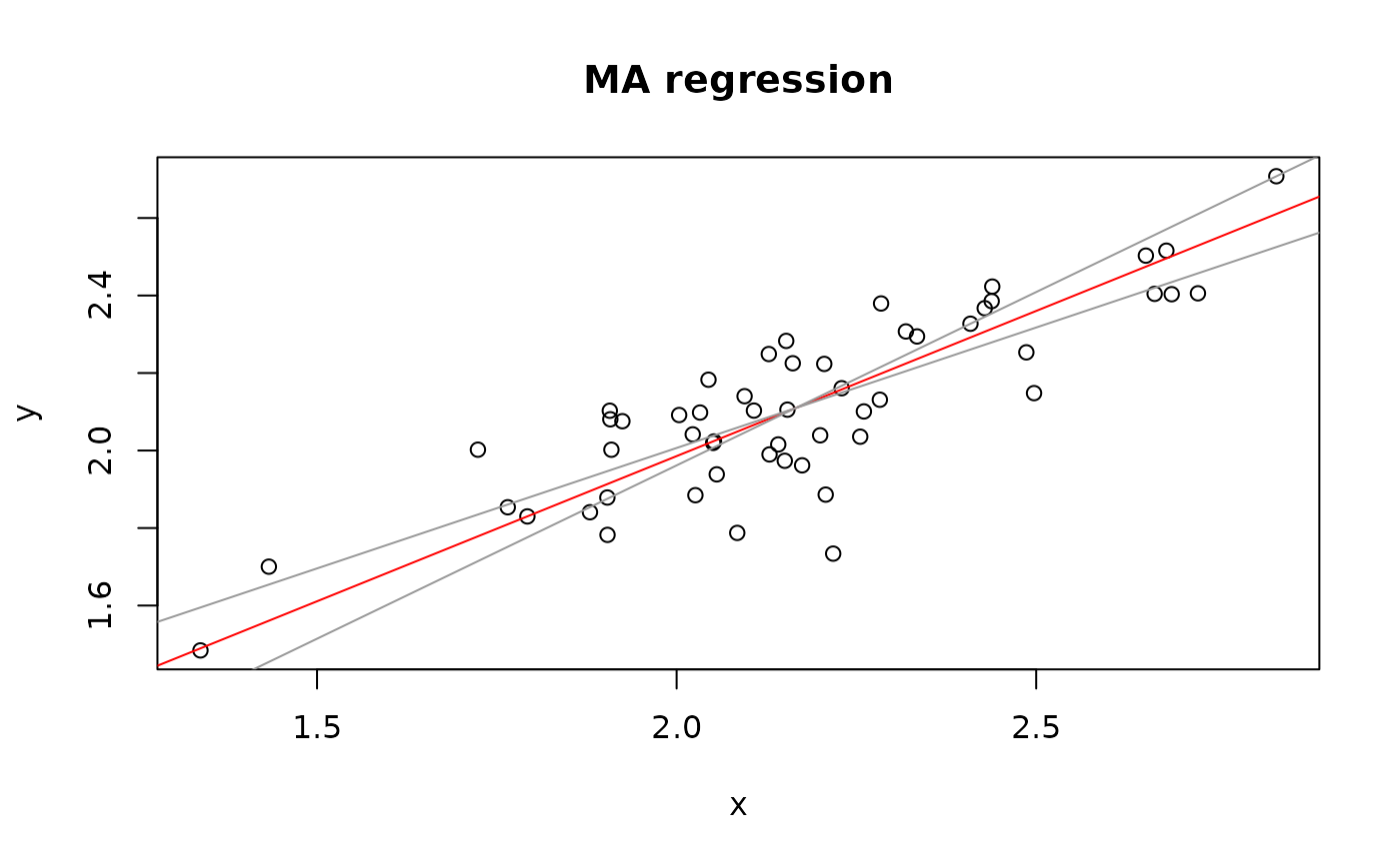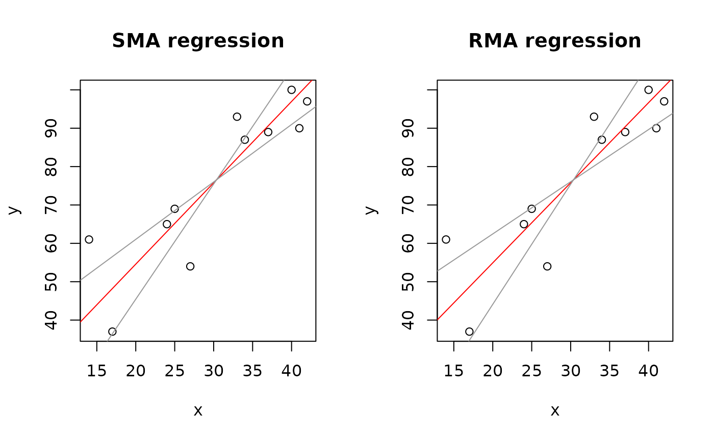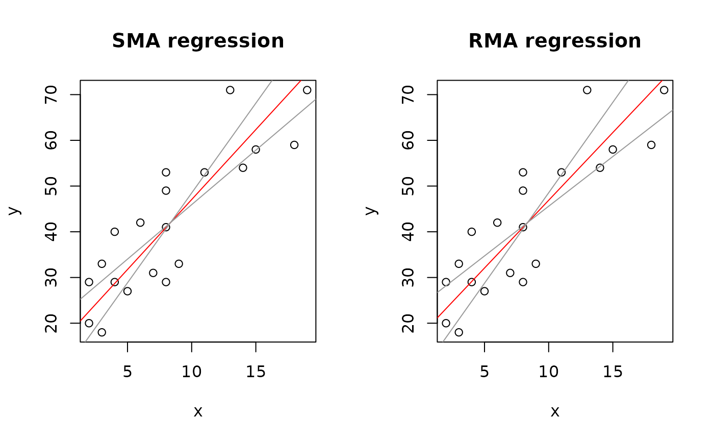 method="SMA", or method="RMA", and its 95 percent confidence interval.