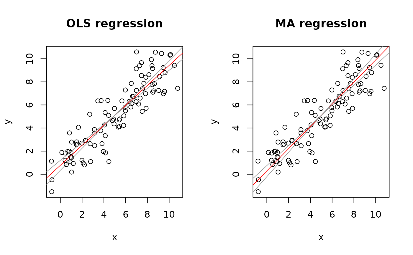regression lines, specified by method="OLS", method="MA" (default),