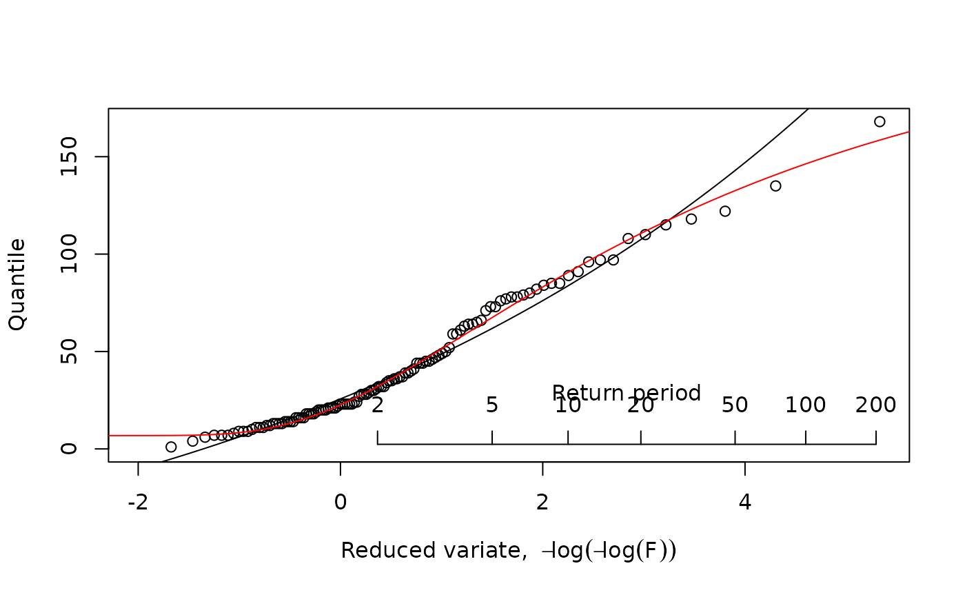 xlab = expression("Reduced variate, " * -log(-log(italic(F)))),