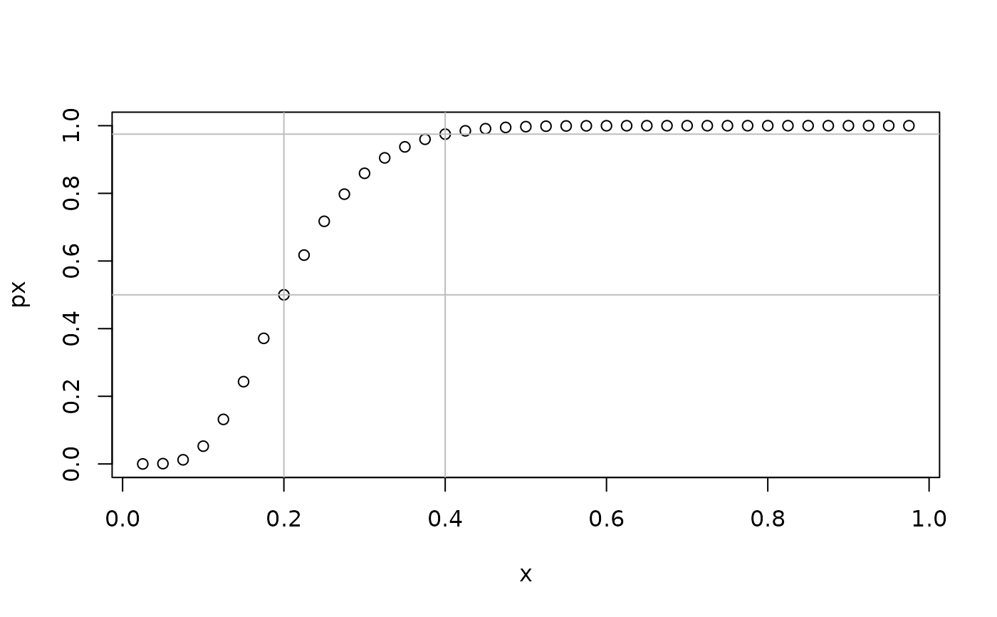 plot(px~x); abline(v = c(med,upper),col = "gray"); abline(h = c(0.5,0.975),col = "gray")