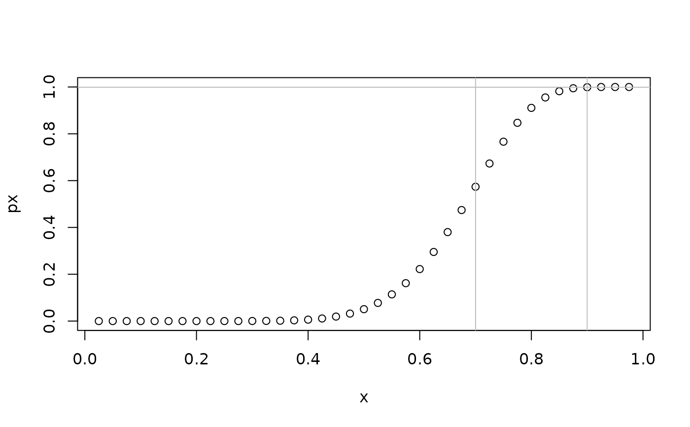 plot(px~x); abline(v = c(mode,upper),col = "gray"); abline(h = c(0.999),col = "gray")