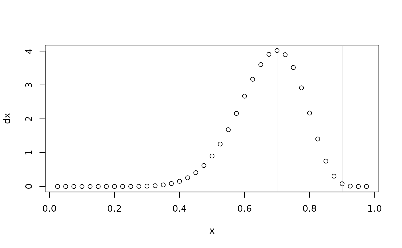 plot(dx~x); abline(v = c(mode,upper),col = "gray")