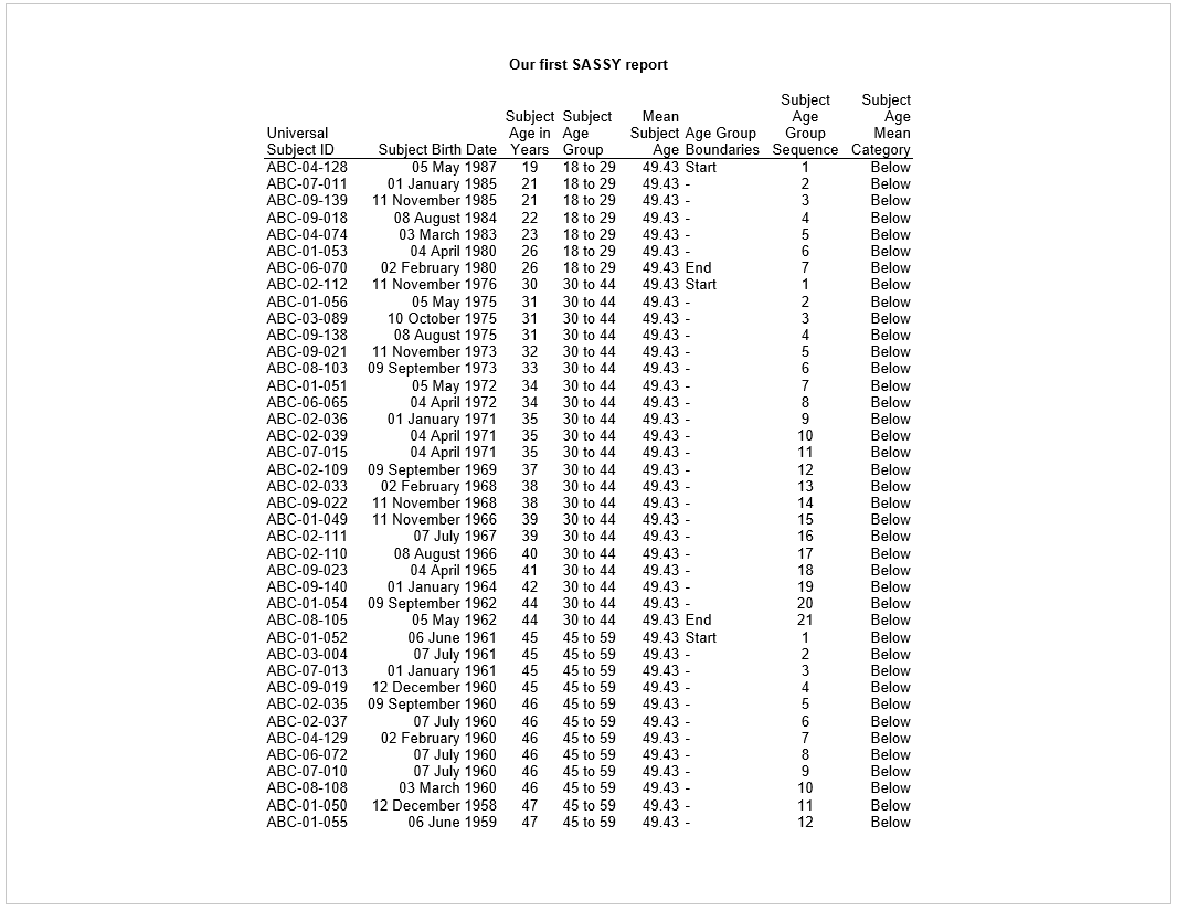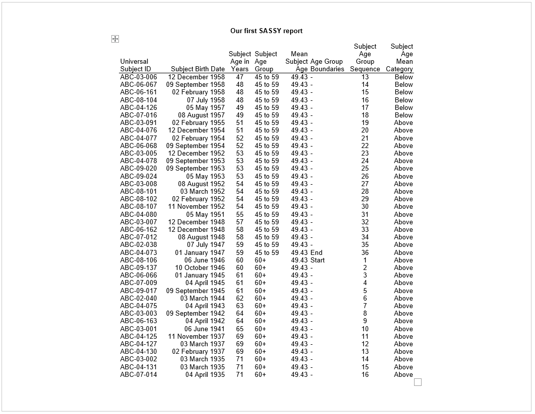 > titles("Our first SASSY report", bold = TRUE) %>%