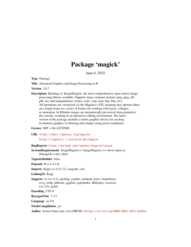 install.packages("magick")The binary CRAN packages work out of the box and have most important features enabled. Use magick_config to see which features and formats are supported by your version of ImageMagick.