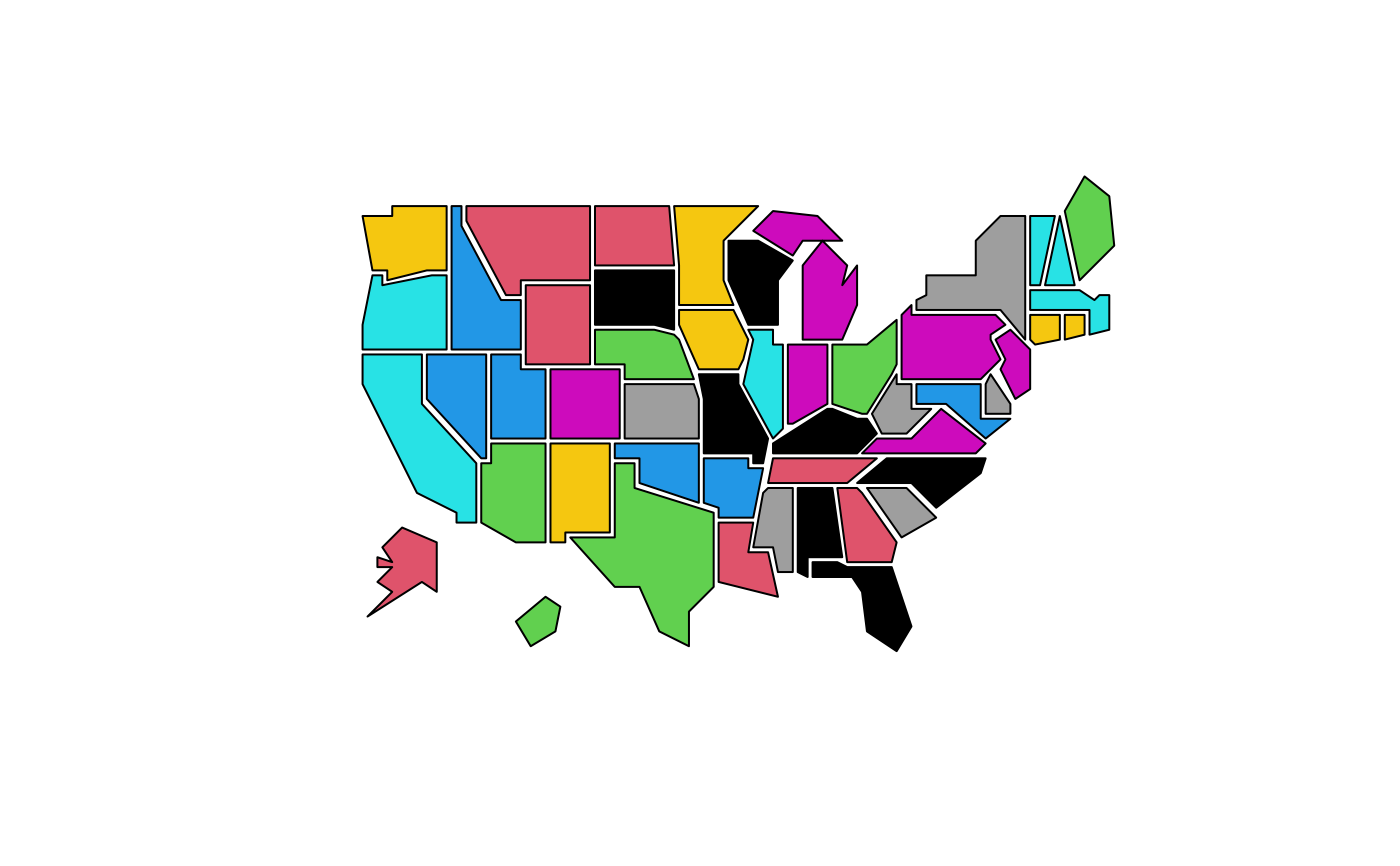 state.vbm.RdThis database produces a map of the states of the United States mainland. The Visibility Base Map was created by Mark Monmonier to provide simplified state shapes with sufficient areas to allow annotations in even the small states.