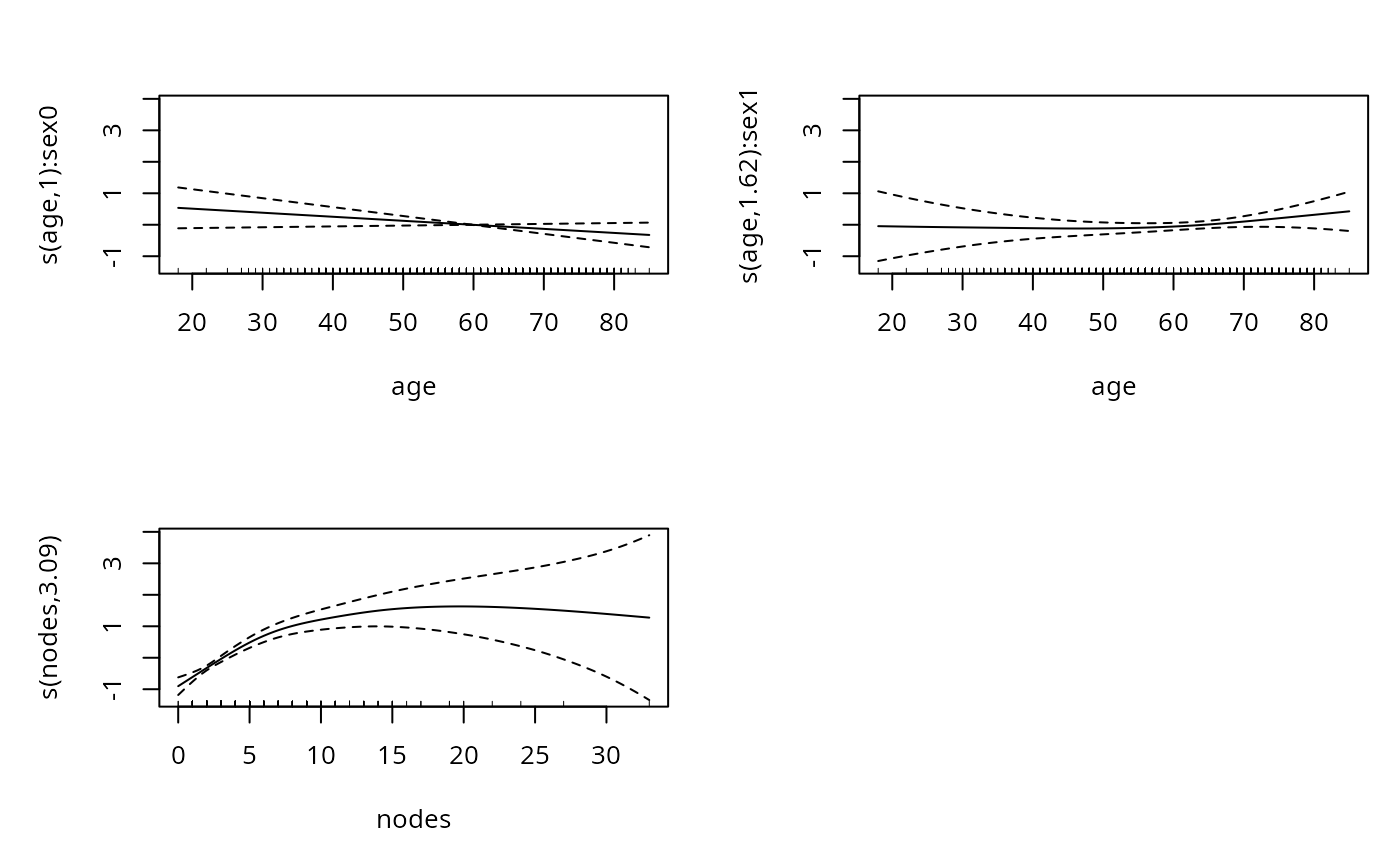 b <- gam(logt~s(age,by=sex)+sex+s(nodes)+perfor+rx+obstruct+adhere,