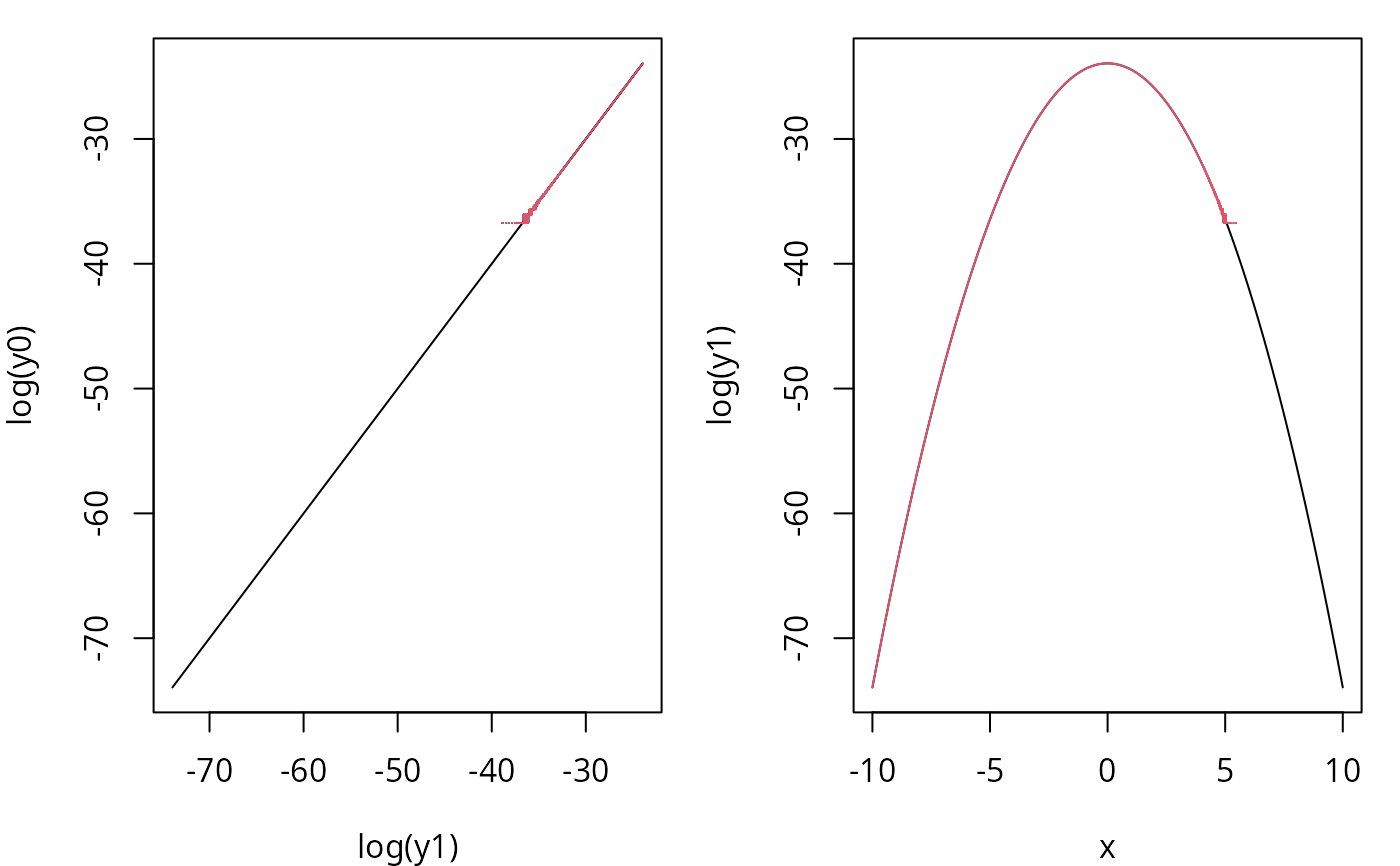 lines(log(y1[x>0]),log(y0[x>0]),col=2)