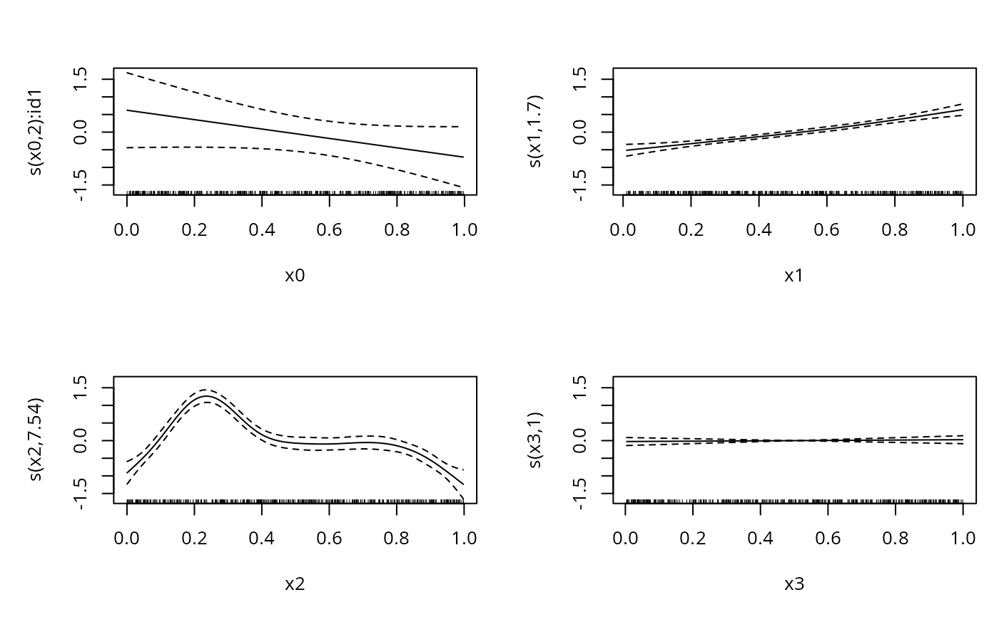 b1 <- gam(y~s(x0,by=id1)+s(x1)+s(x2)+s(x3),
