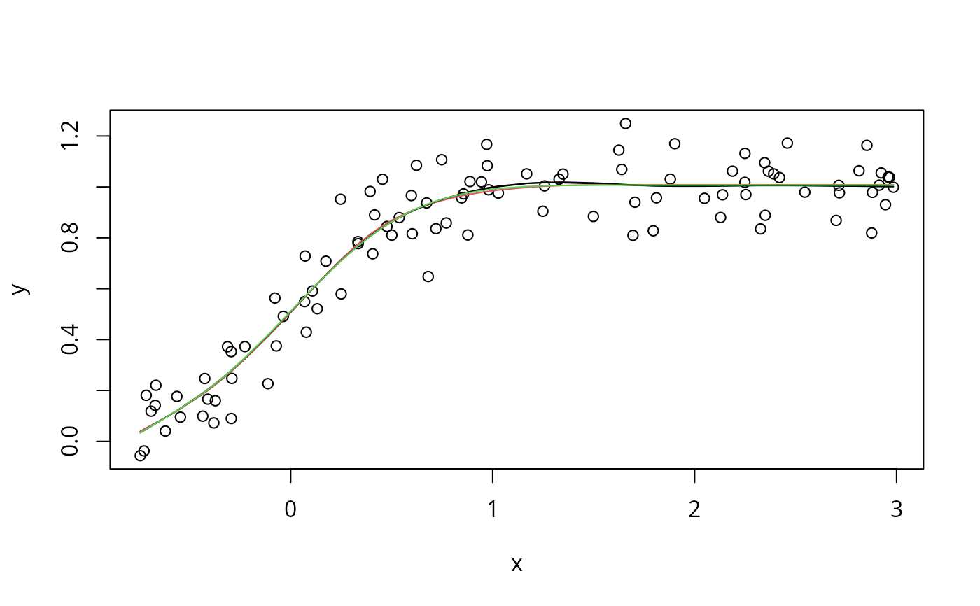 f.ug <- gam(y~s(x,k=10)); lines(x,fitted(f.ug))