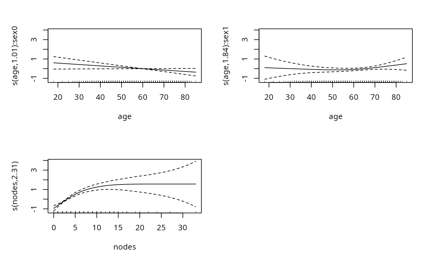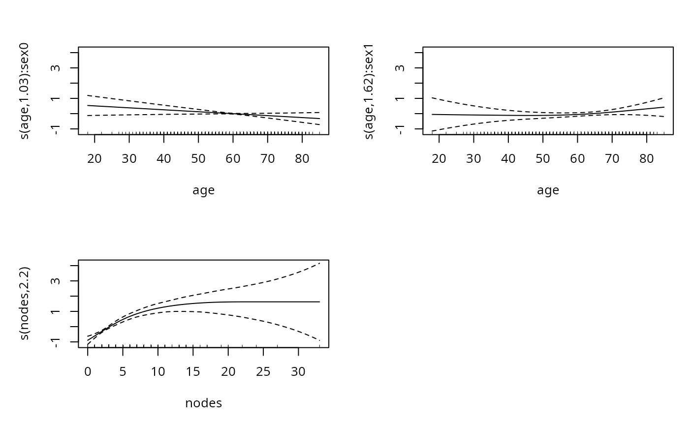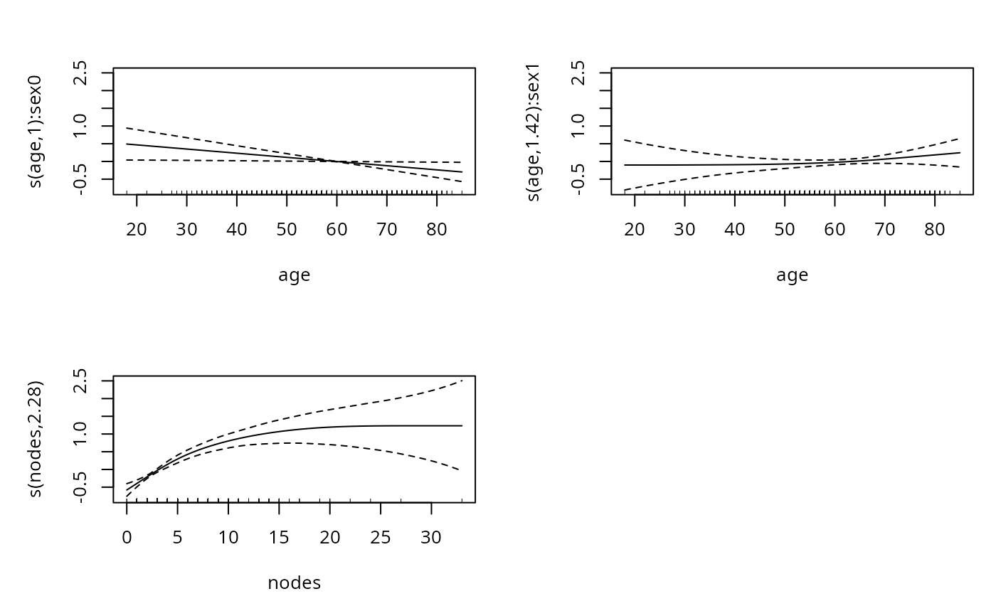 #> time ~ s(age, by = sex) + sex + s(nodes, bs = "sc", xt = "m+") +