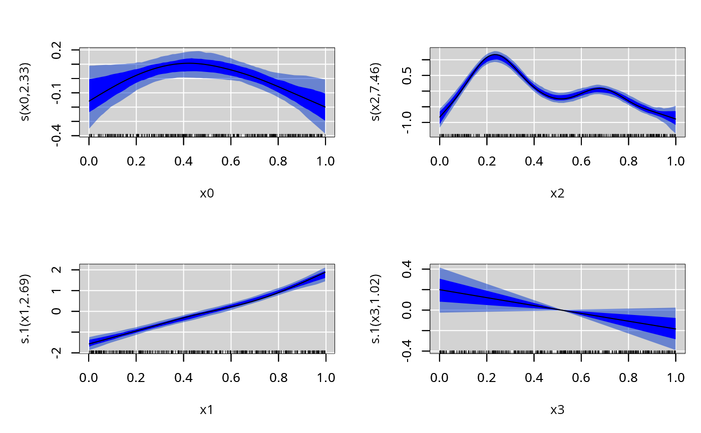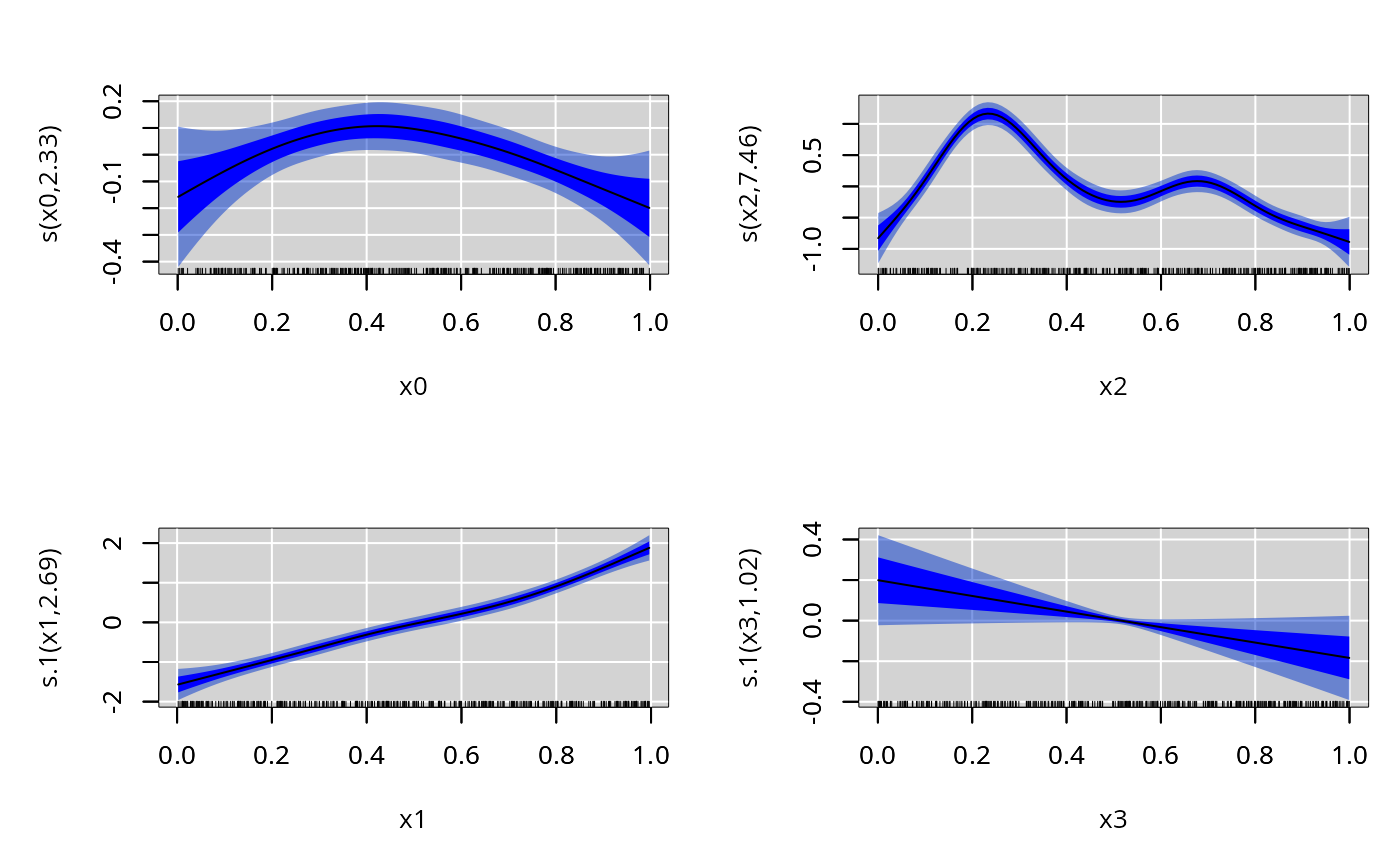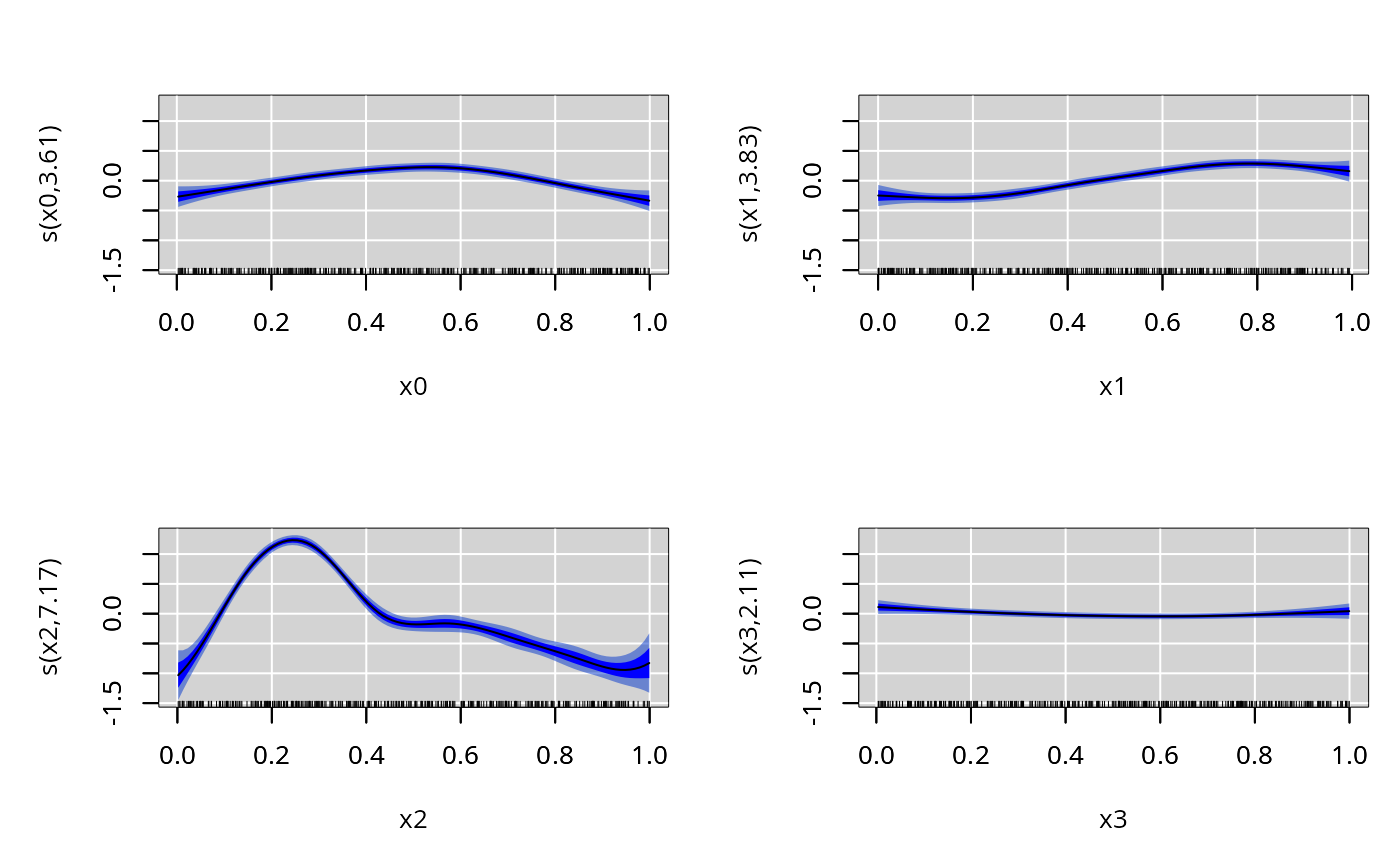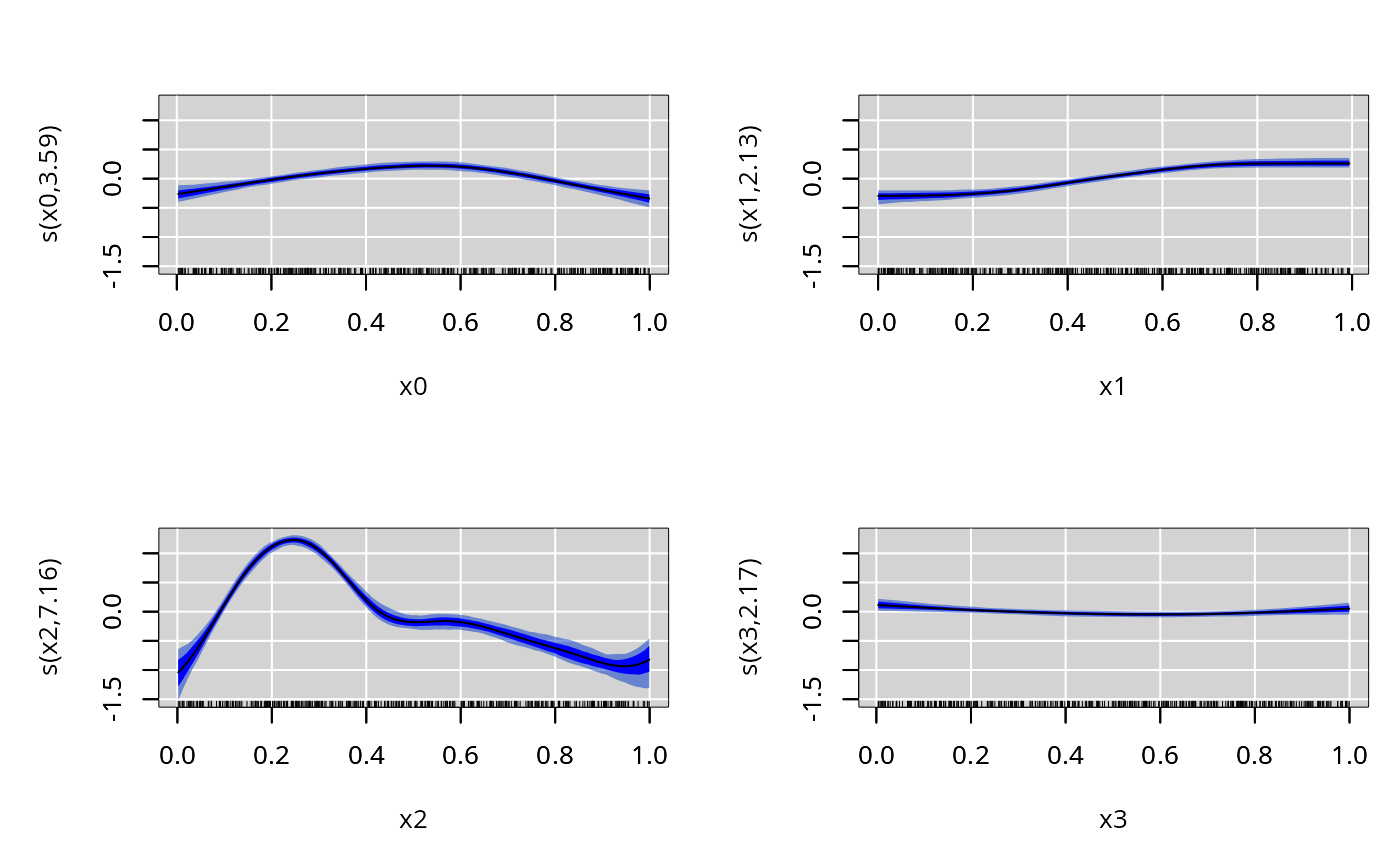#> y ~ s(x0, bs = "bs", k = k) + s(x1, bs = "bs", k = k) + s(x2,