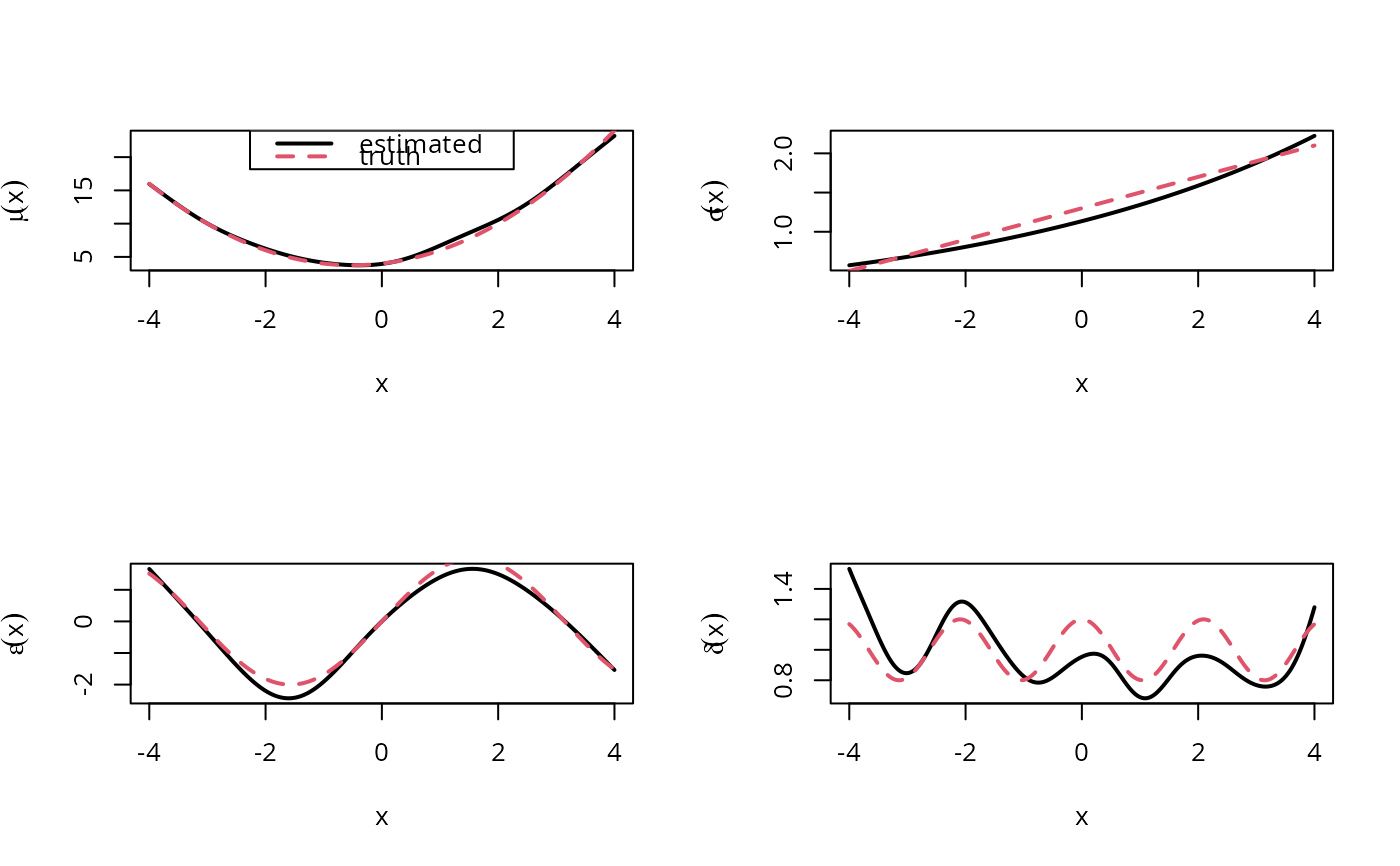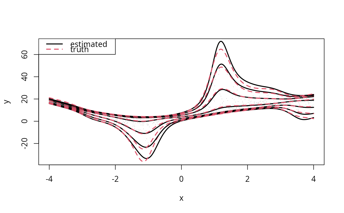 legend("top", c("estimated", "truth"), col = 1:2, lty = 1:2, lwd = 2)