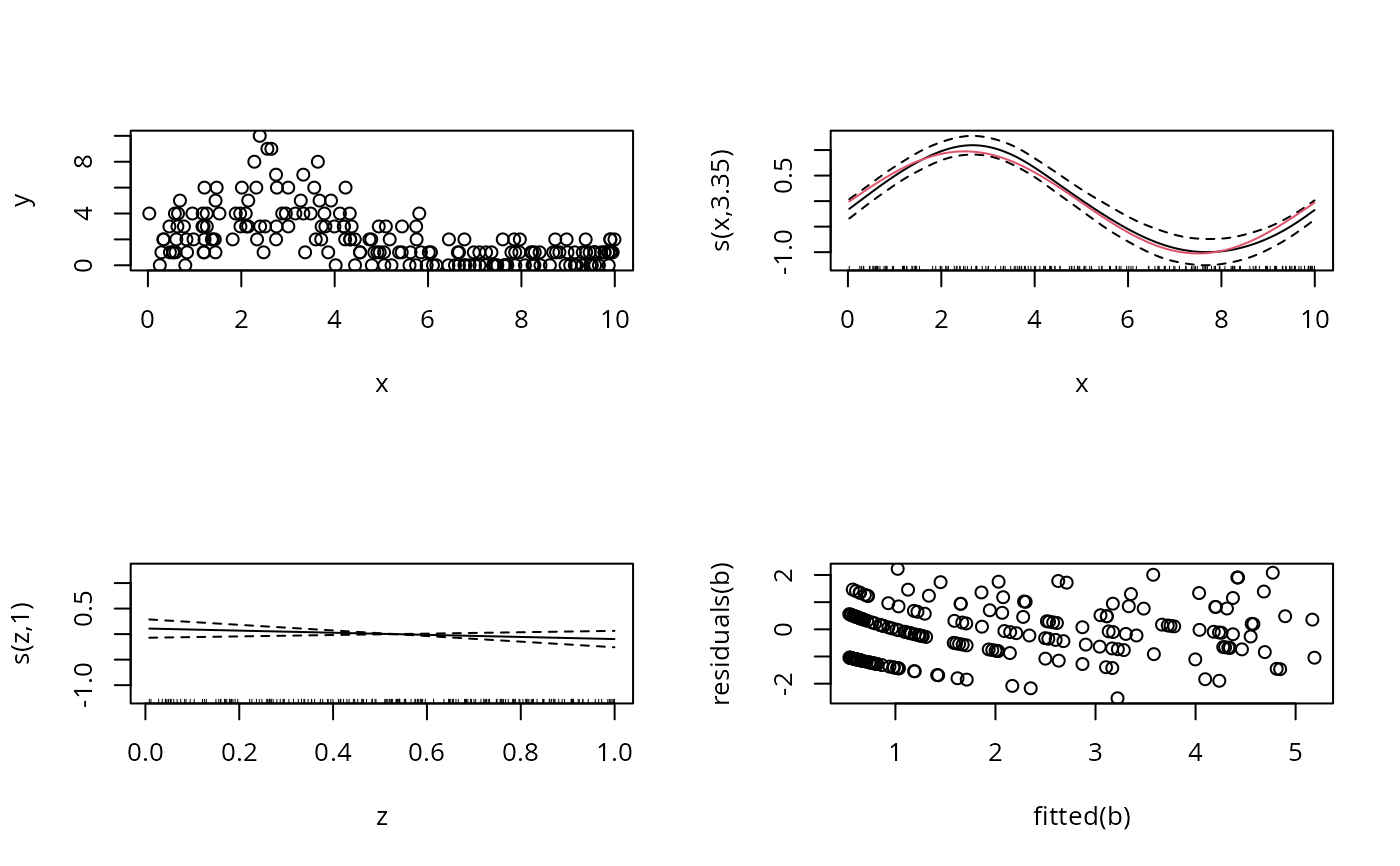 b <- gam(y ~ s(x,bs="cc",k=12) + s(z),family=poisson,