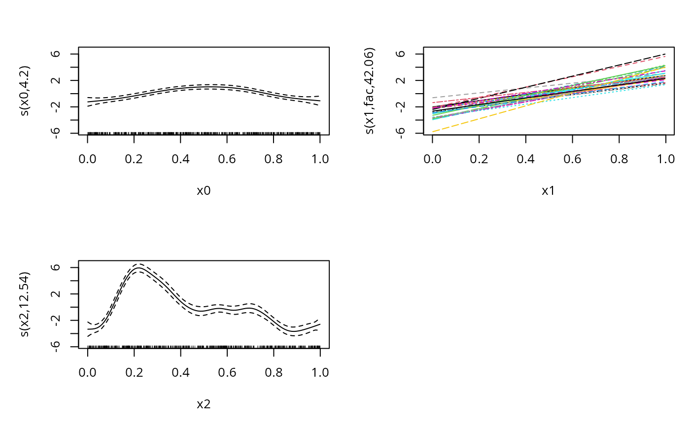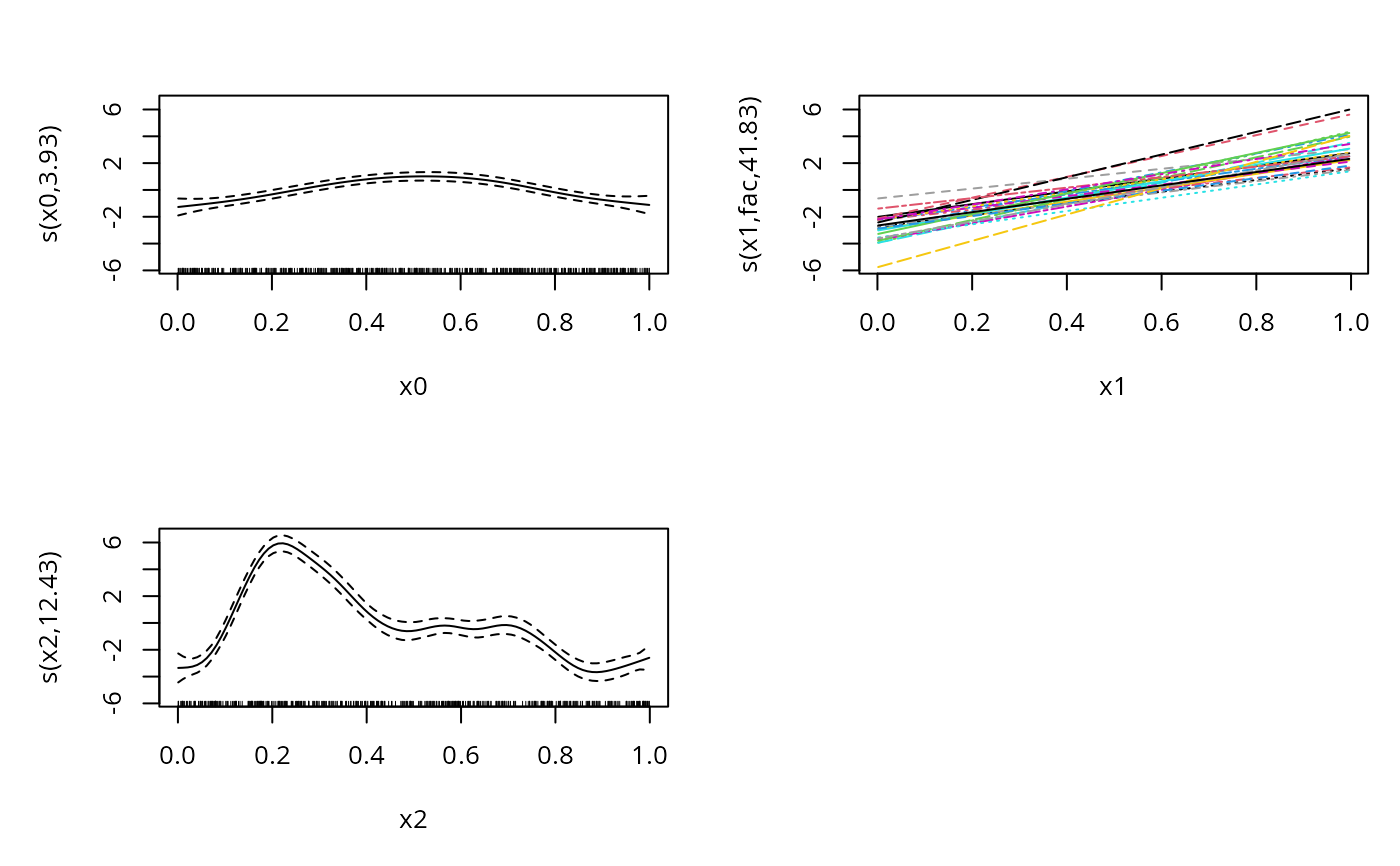 #> y ~ s(x0) + s(x1, fac, bs = "fs", k = 5) + s(x2, k = 20)