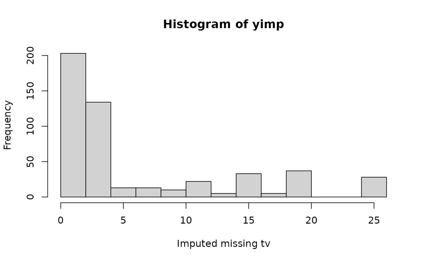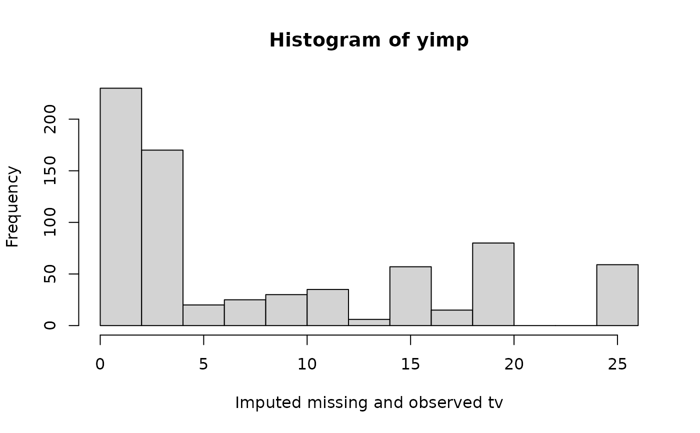 hist(yimp, xlab = "Imputed missing and observed tv")