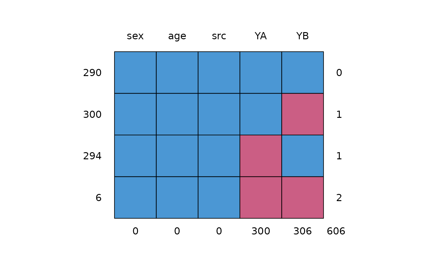 Example dataset to demonstrate imputation of two items (YA and YB). Item YA is administered to sample A and sample E, item YB is administered to sample B and sample E, so sample E acts as a bridge study. Imputation using a bridge study is better than simple equating or than imputation under independence.
