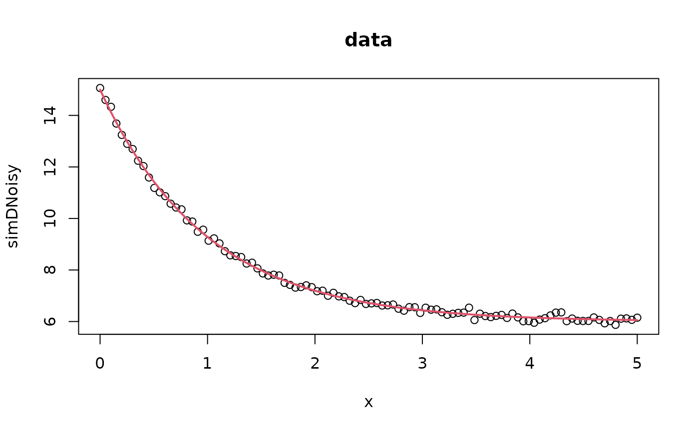 lines(x, fitted(mod), col = 2, lwd = 2)
