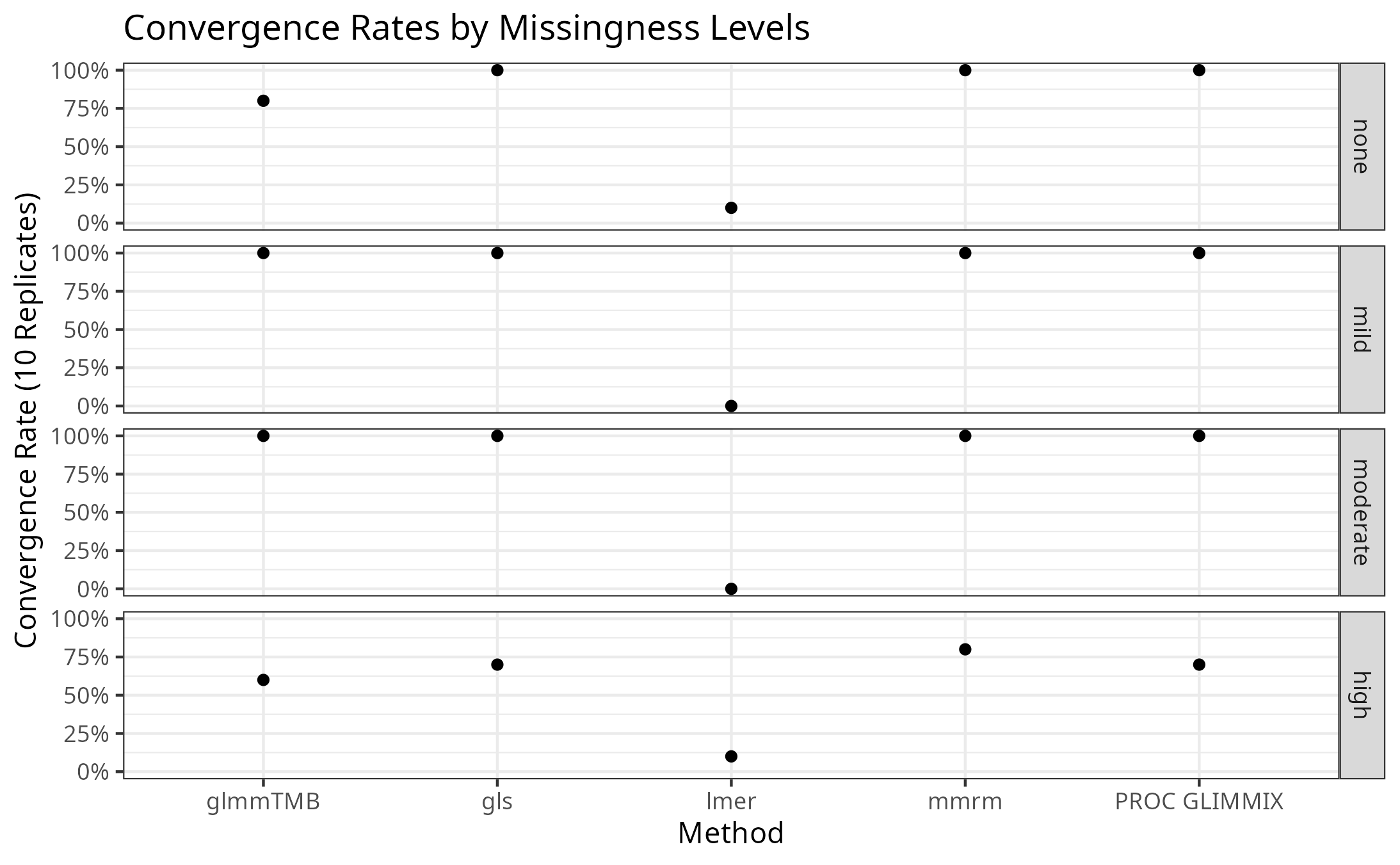 The convergence rates of all implementations for stratified by missingness level is presented in the plot below.