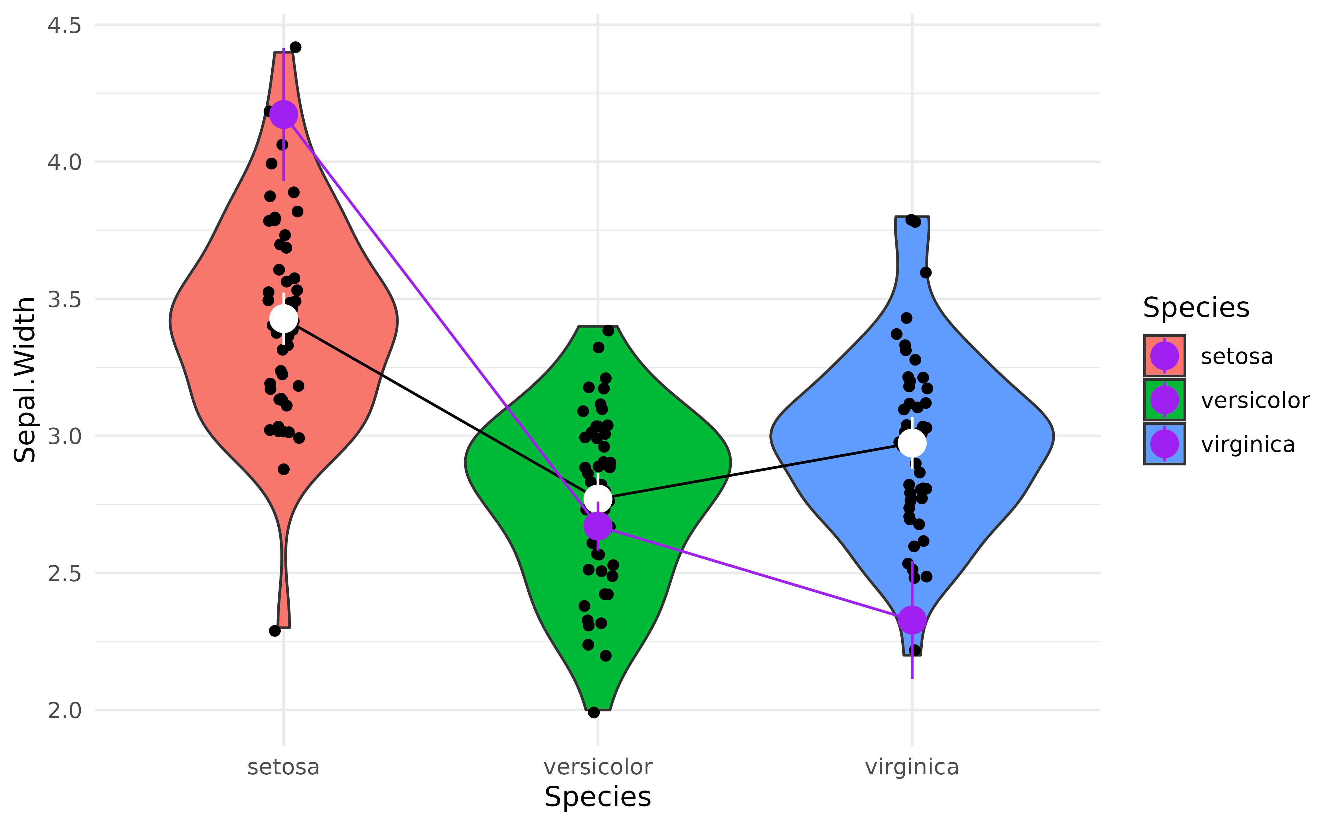 Now let’s add to our previous plot the marginal means from the more complex model (shown in purple) next to each other, which should help us notice how the adjusted means change depending on the predictors.