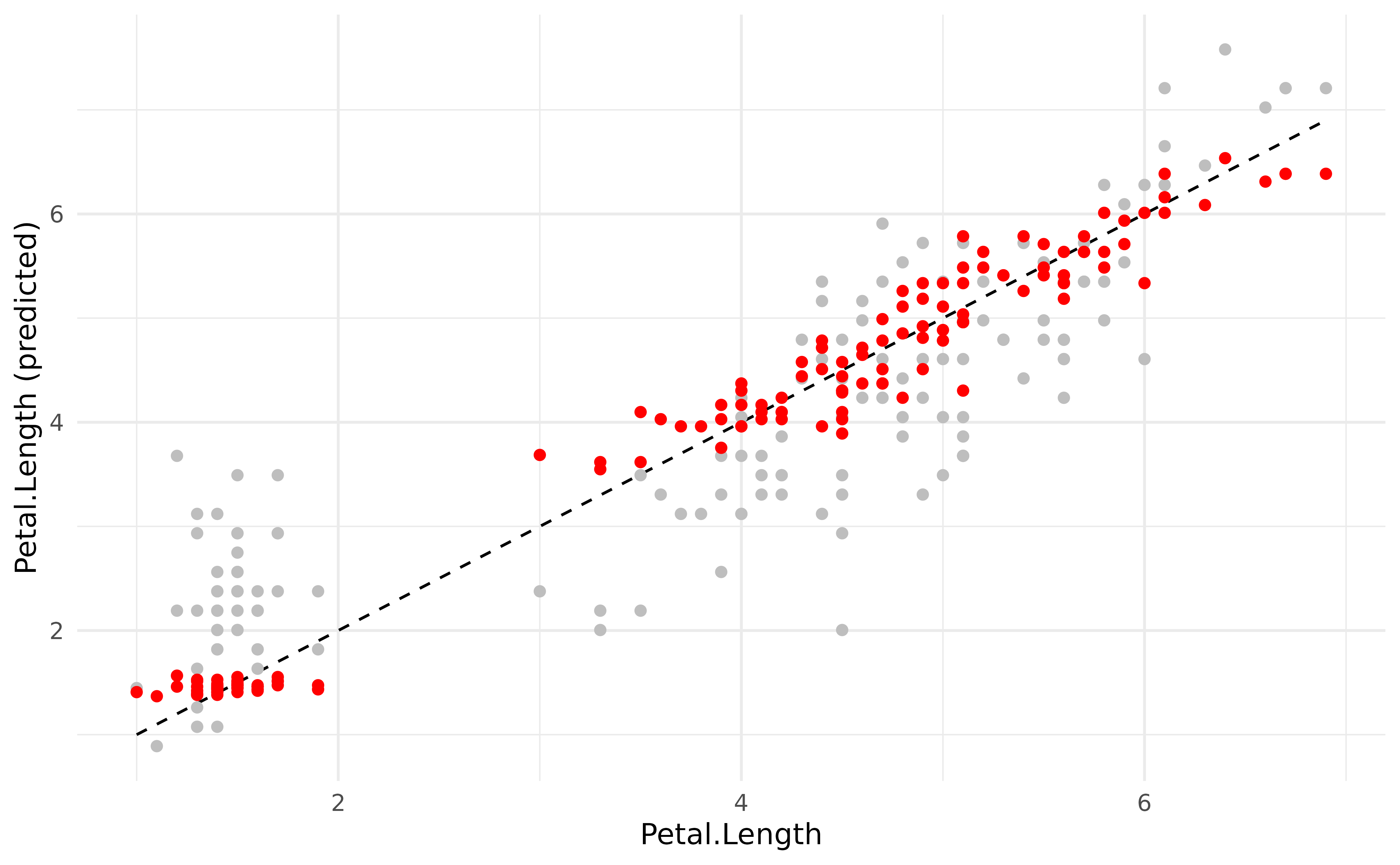 geom_point(aes(x = Petal.Length, y = Predicted), color = "grey") +