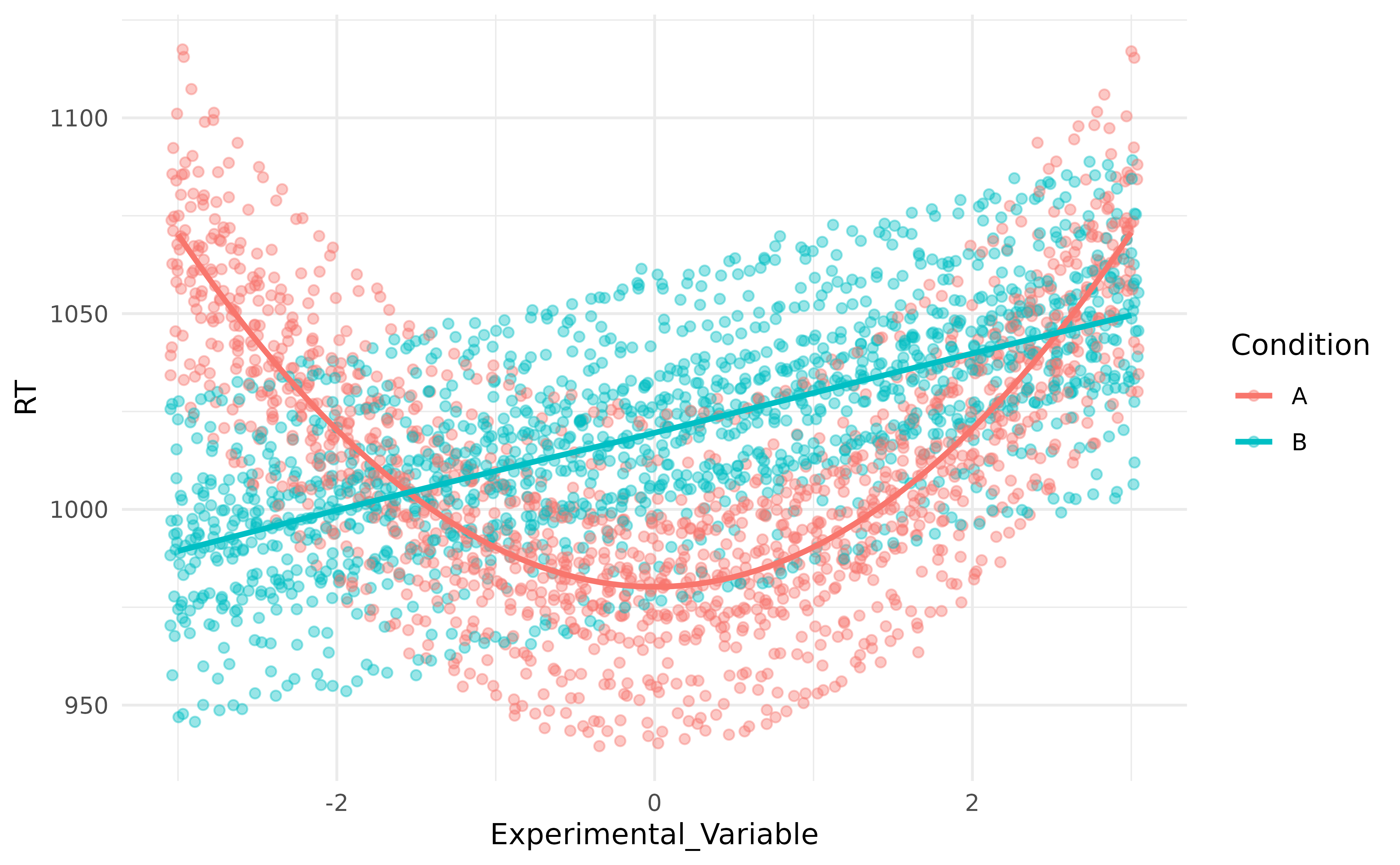 participant$RT <- c(participant$Experimental_Variable[1:(n / 2)]**2 - effect[i], (participant$Experimental_Variable[(n / 2 + 1):n] + effect[i])) + rnorm(n, 0, abs(noise[i]))
