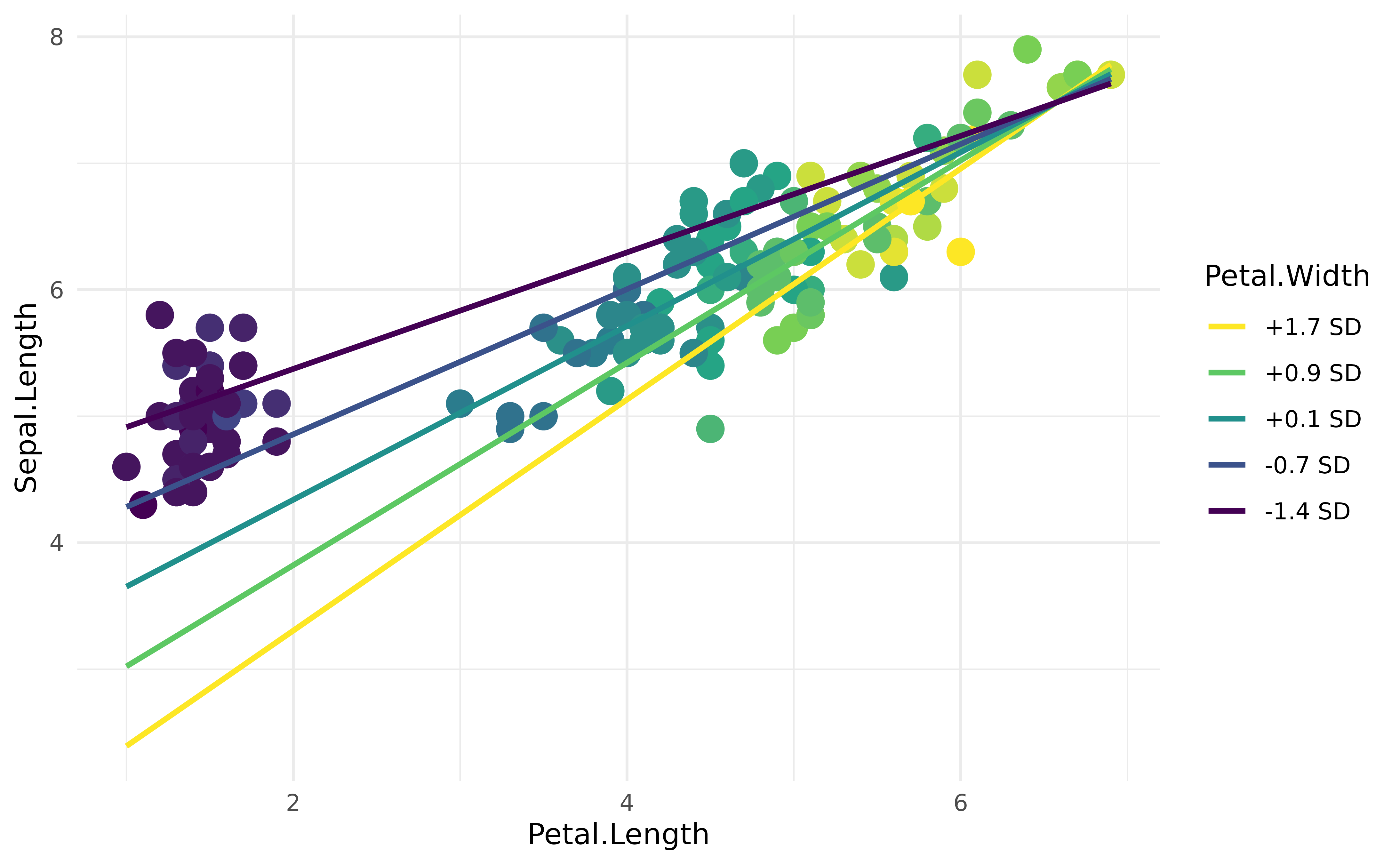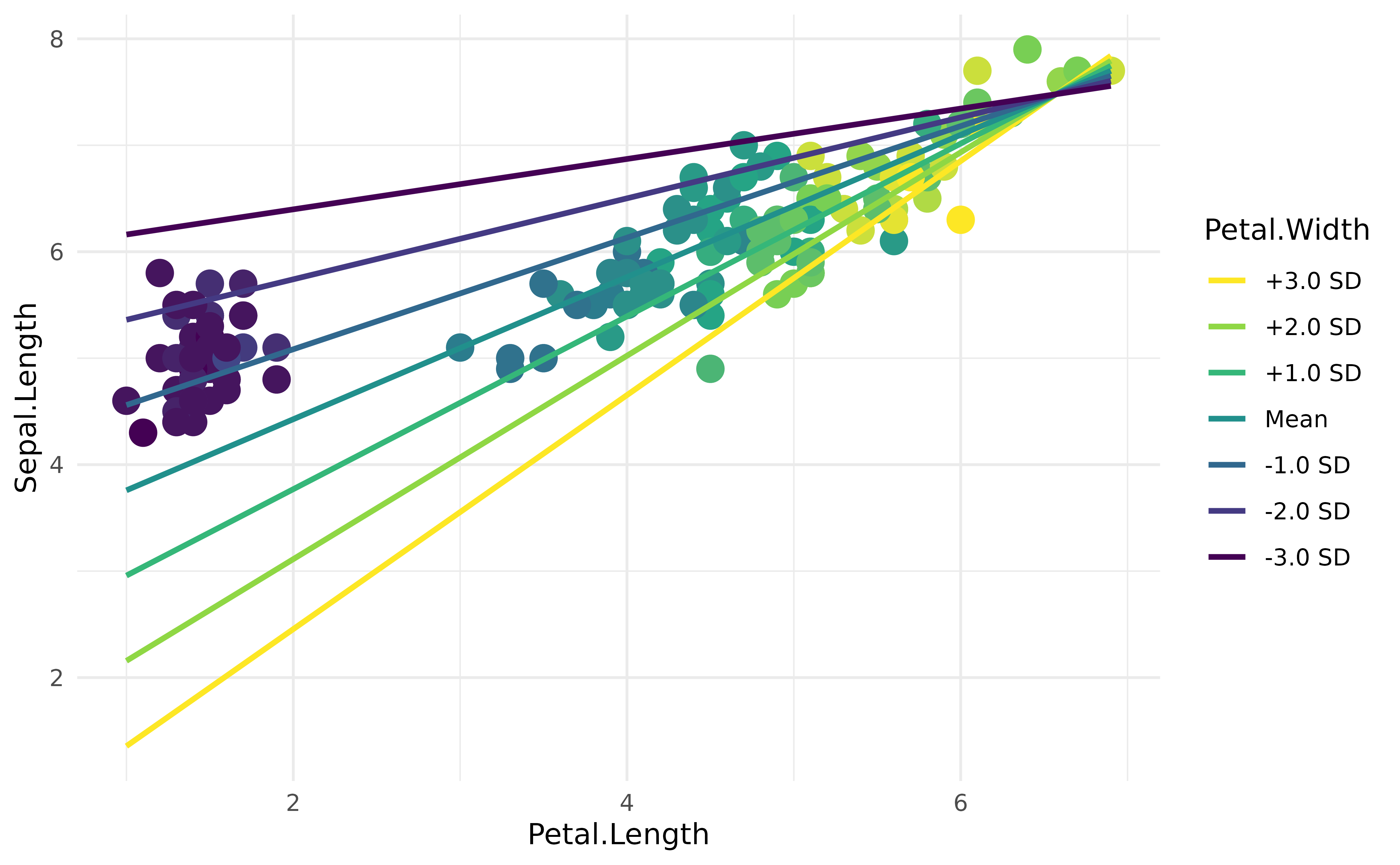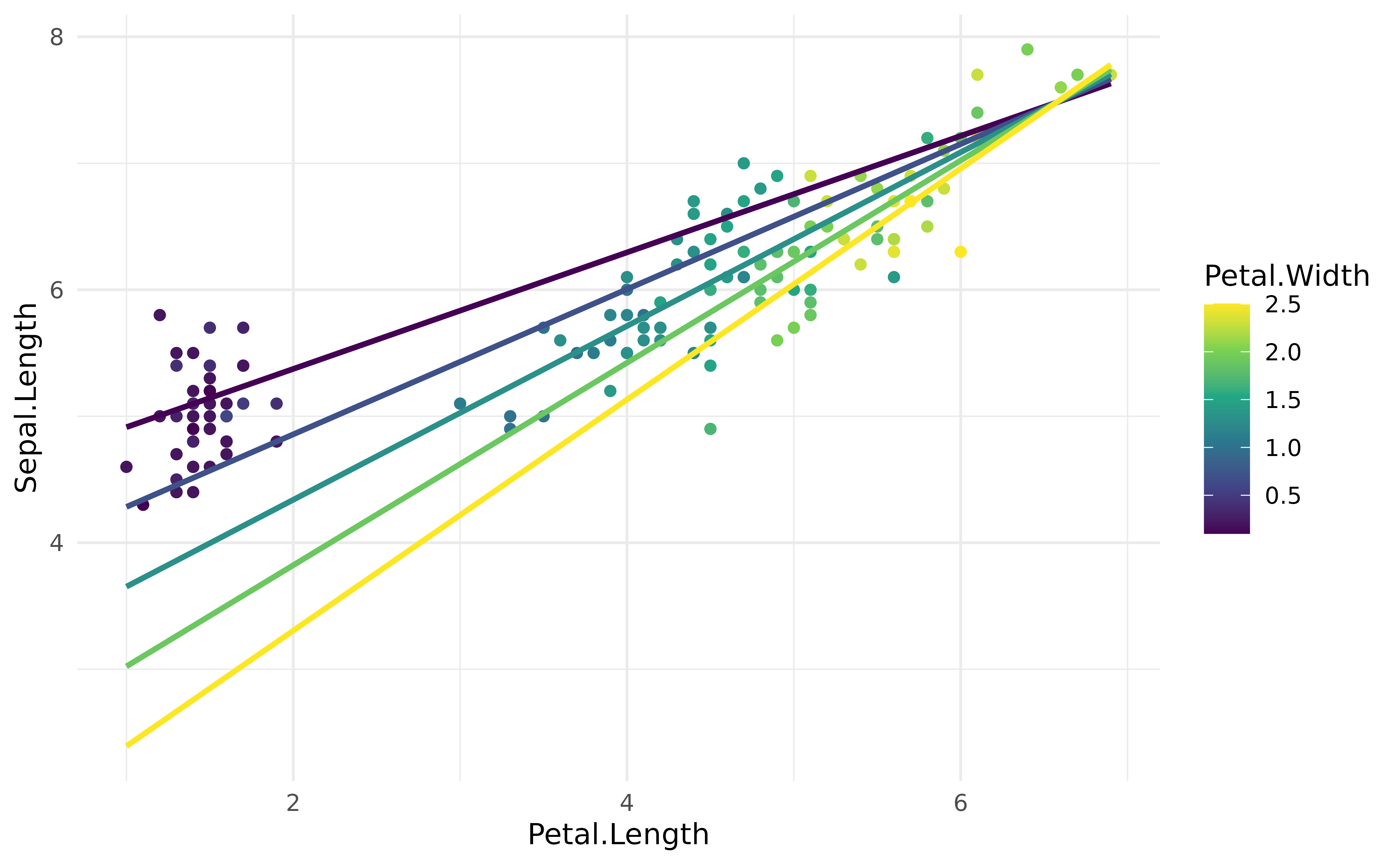 geom_line(data = vizdata, aes(y = Predicted, group = Petal.Width), linewidth = 1) +