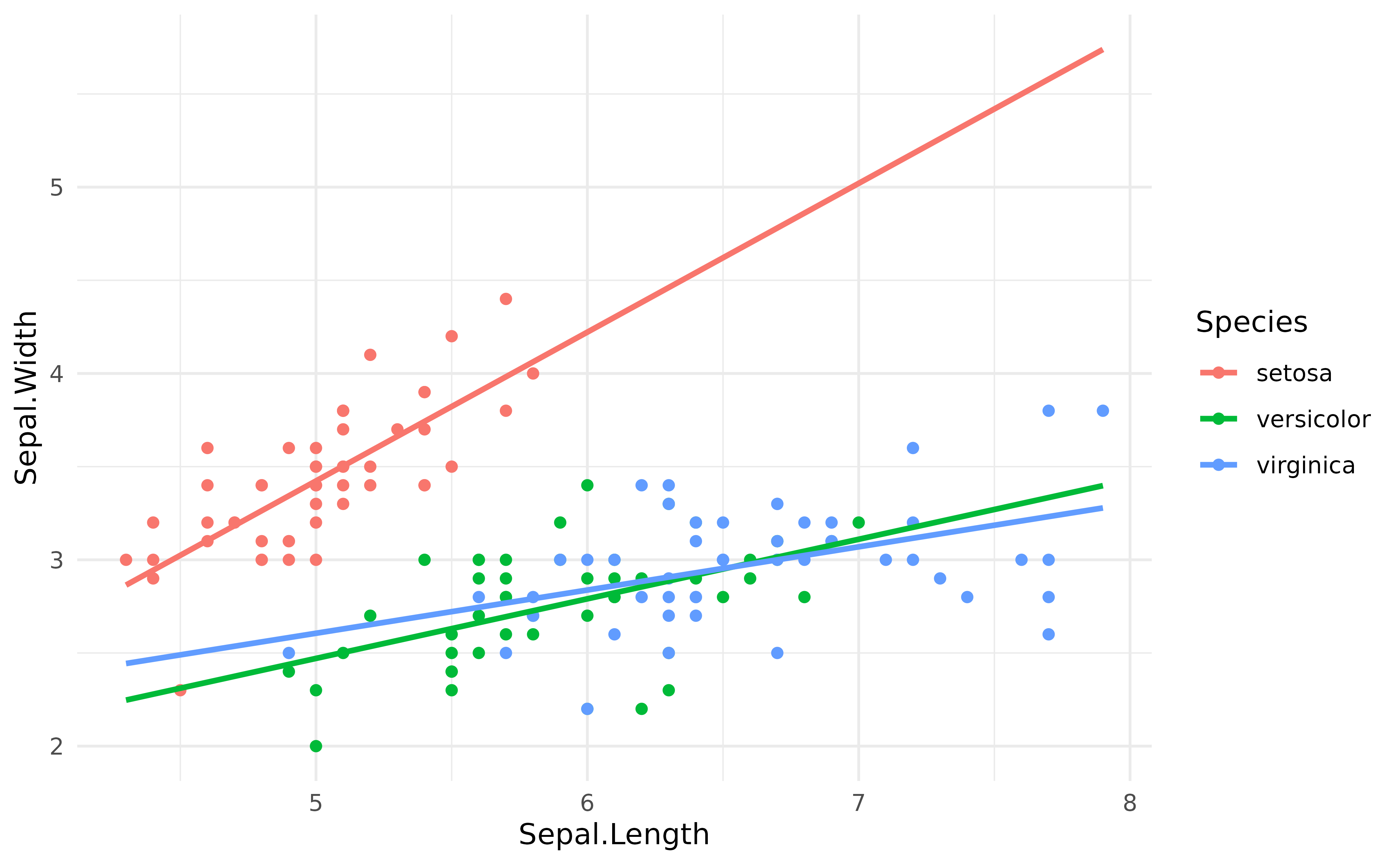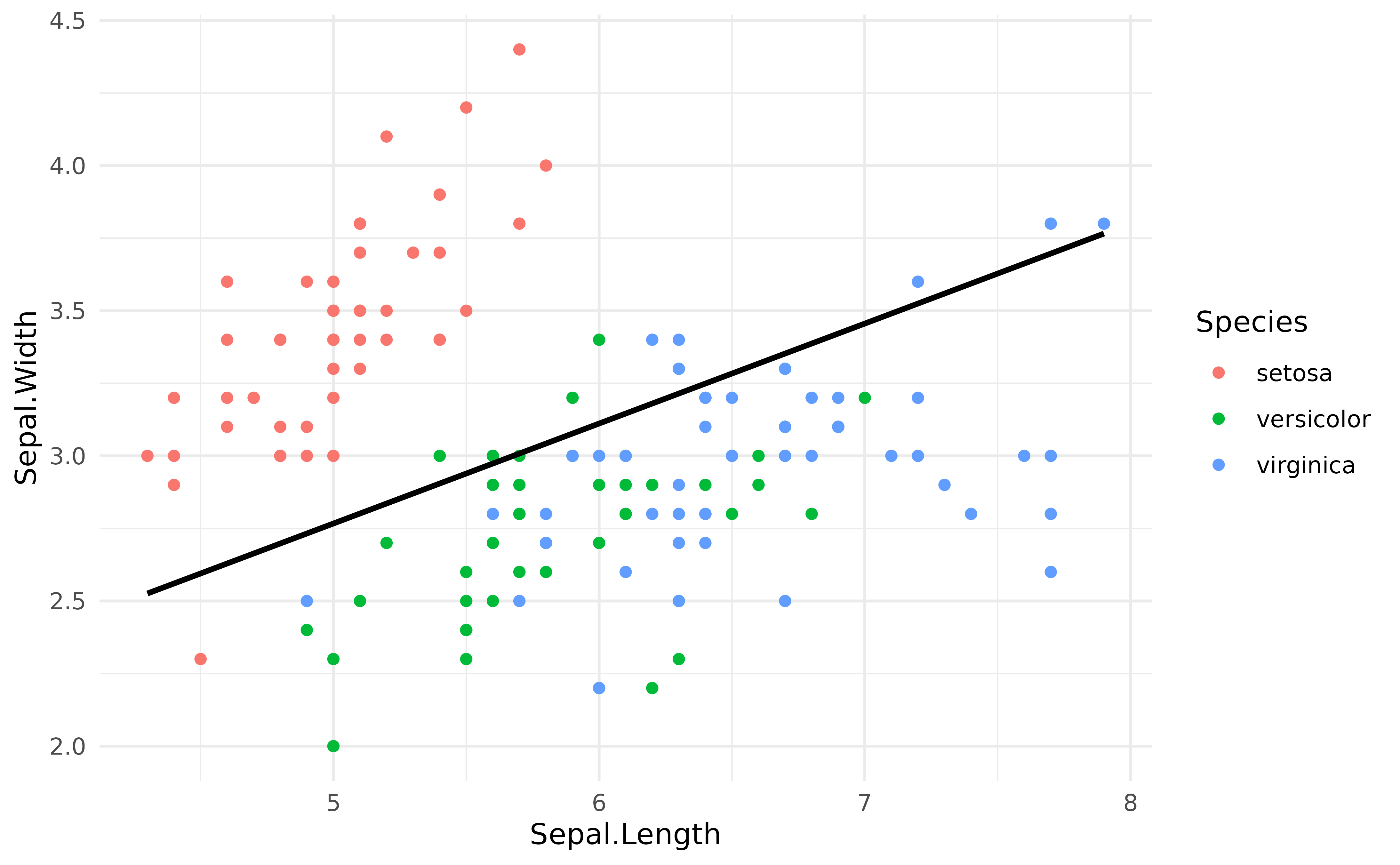 As we can see, when adjusting for the species, the relationship between the two variables has become positive!