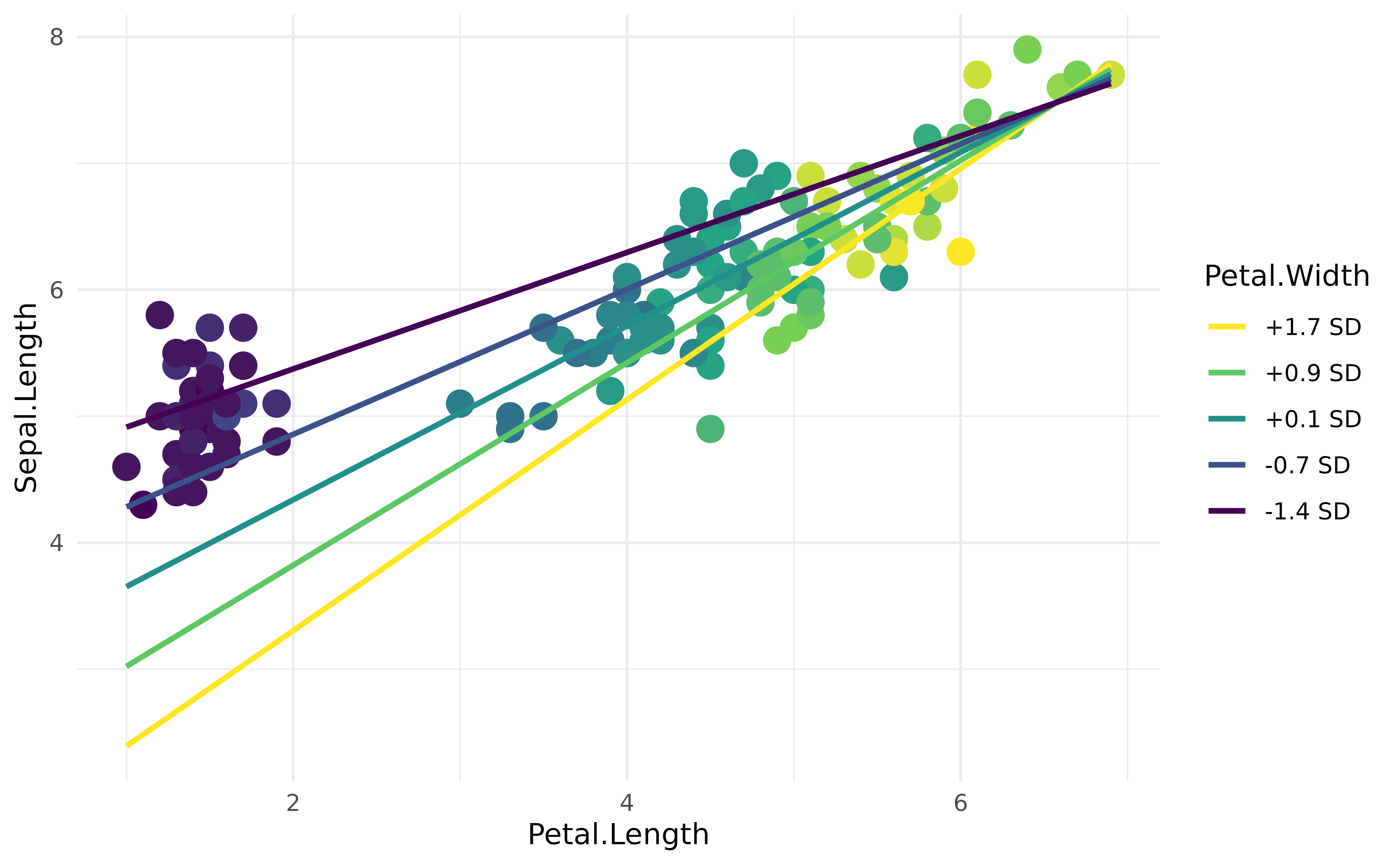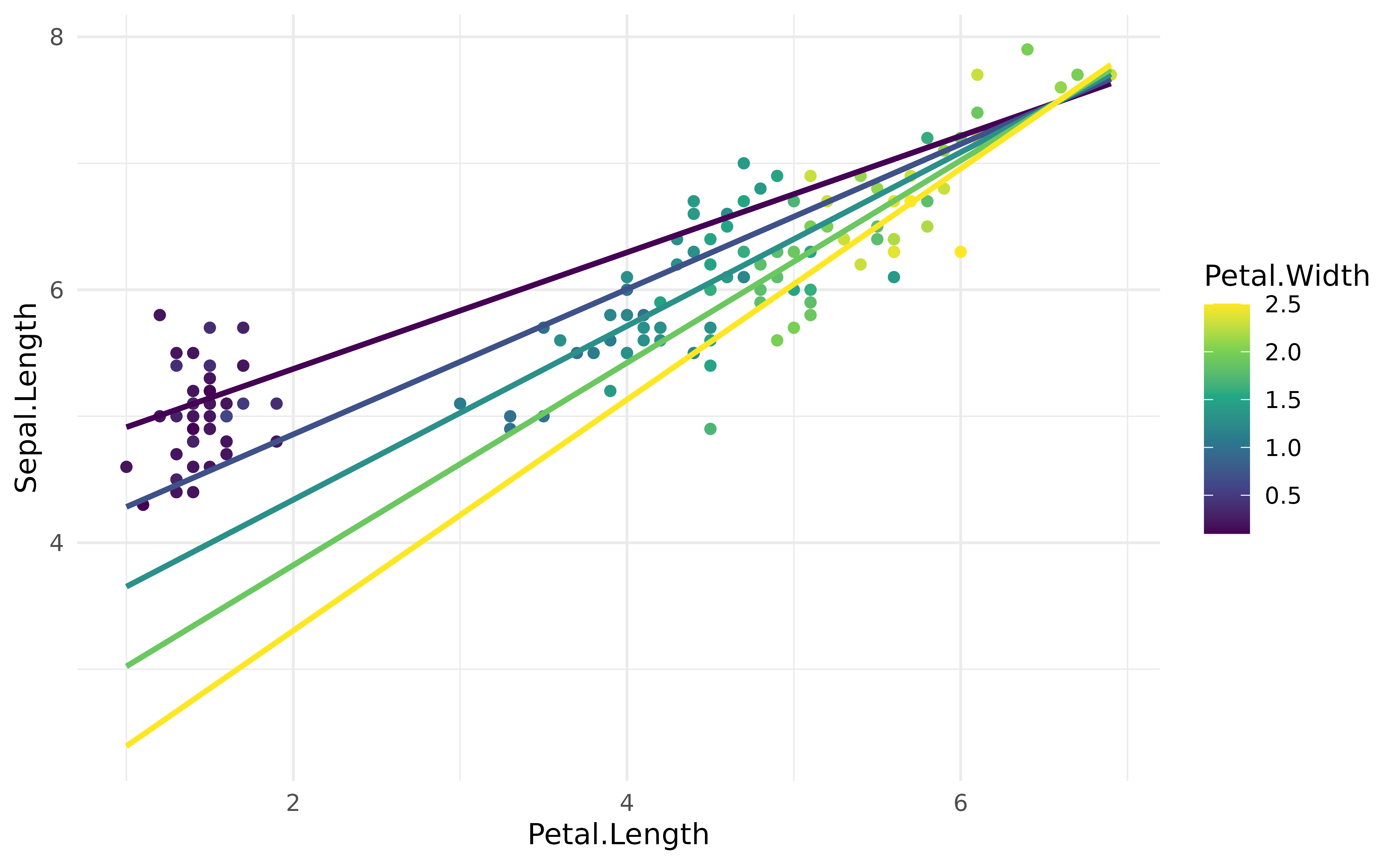 geom_line(data = vizdata, aes(y = Predicted, group = Petal.Width), linewidth = 1) +