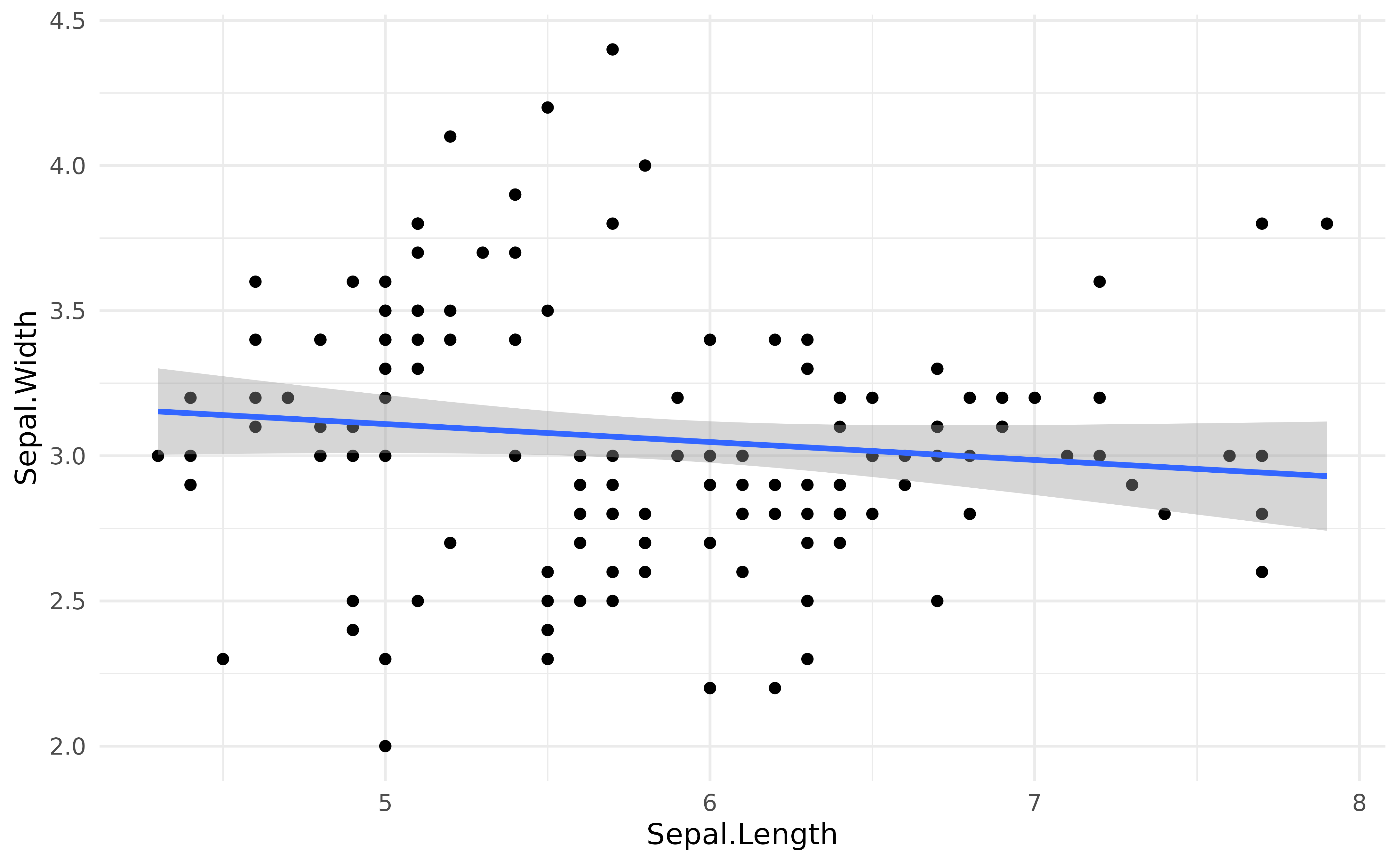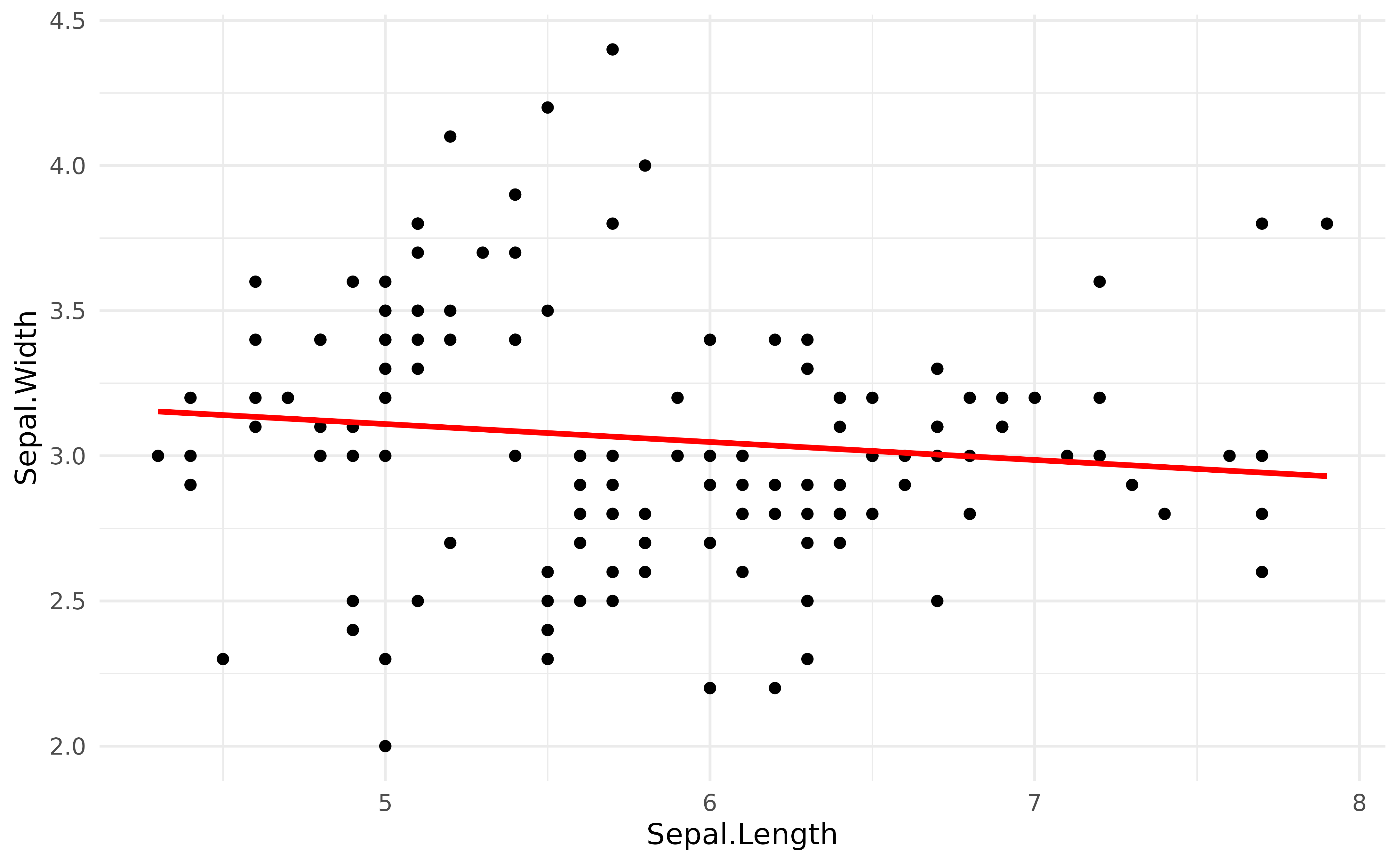 ggplot(iris, aes(x = Sepal.Length, y = Sepal.Width)) +