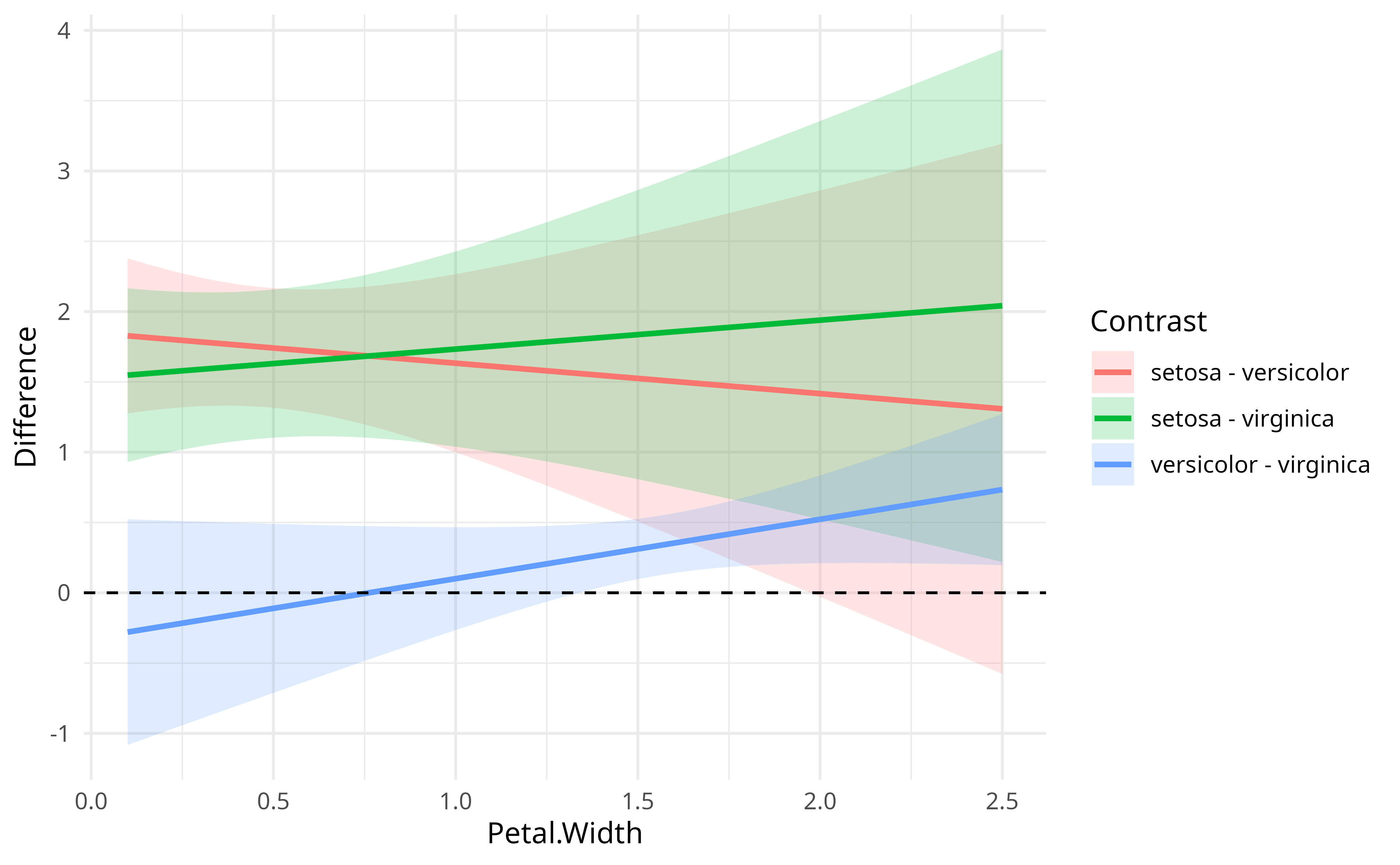 contrasts at 100 equally-spaced points of Petal.Width, that