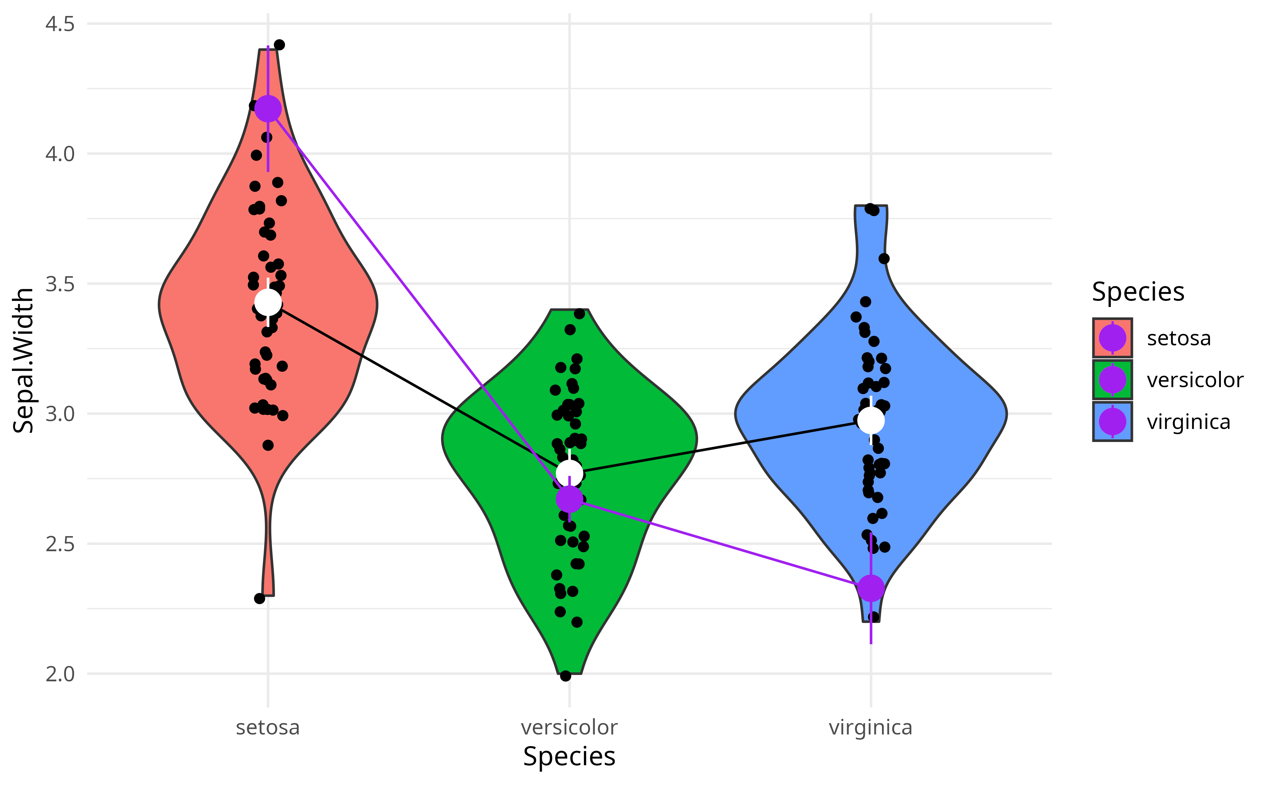 Now let’s add to our previous plot the marginal means from the more complex model (shown in purple) next to each other, which should help us notice how the adjusted means change depending on the predictors.