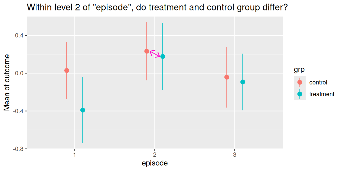 #> b2 = episode [3], grp [control]Does difference between two levels of episode in the control group differ from difference of same two levels in the treatment group?