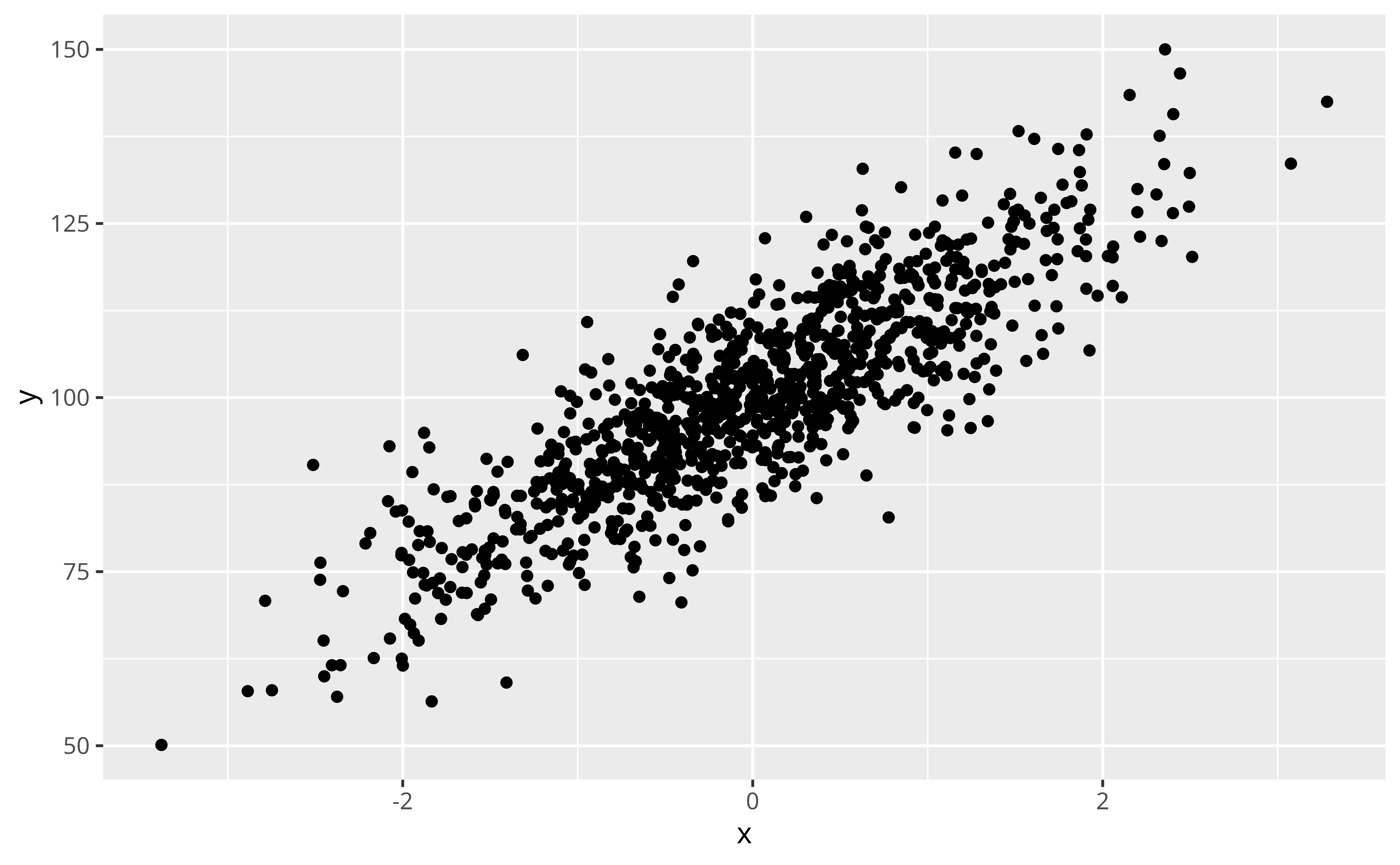 data <- bayestestR::simulate_correlation(r = 0.85, n = 1000, names = c("y", "x"), mean = c(100, 0), sd = c(15, 1))