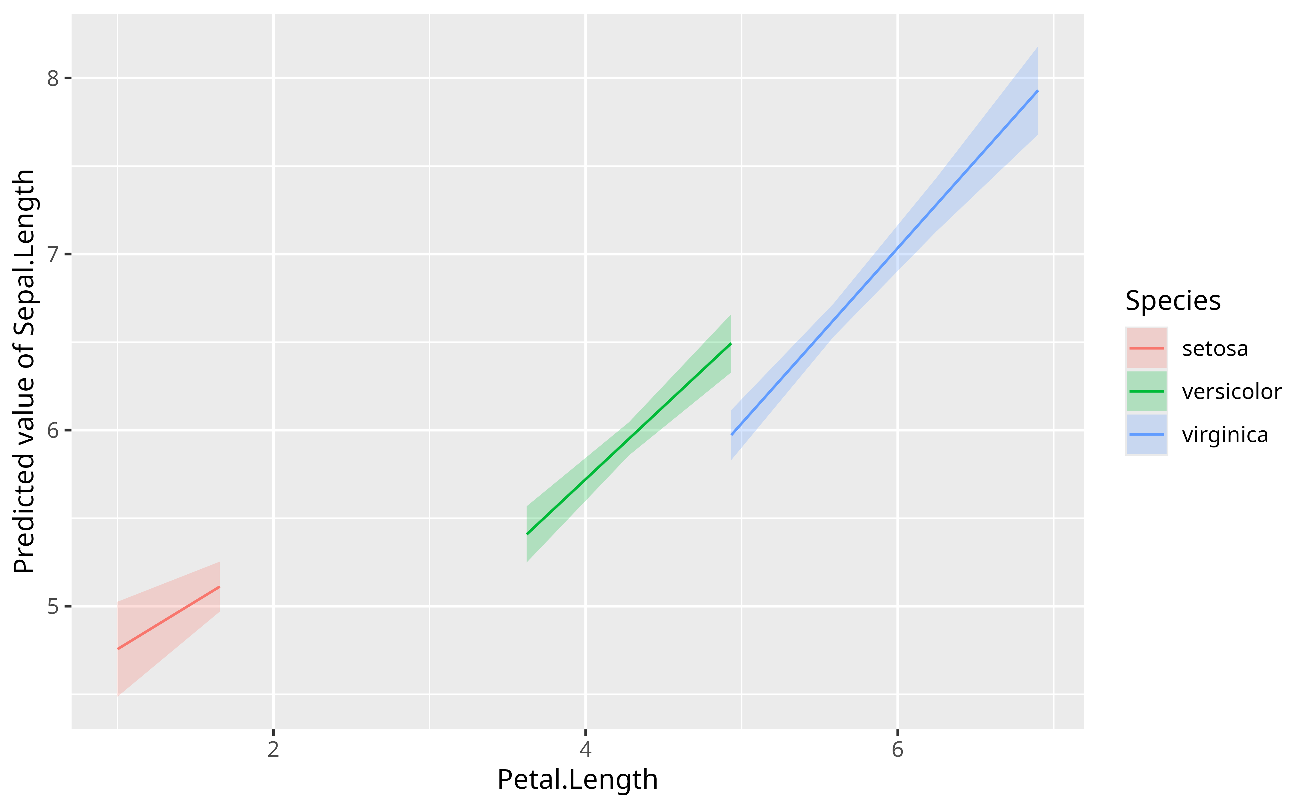 model <- lm(Sepal.Length ~ Petal.Length * Species, data = iris)