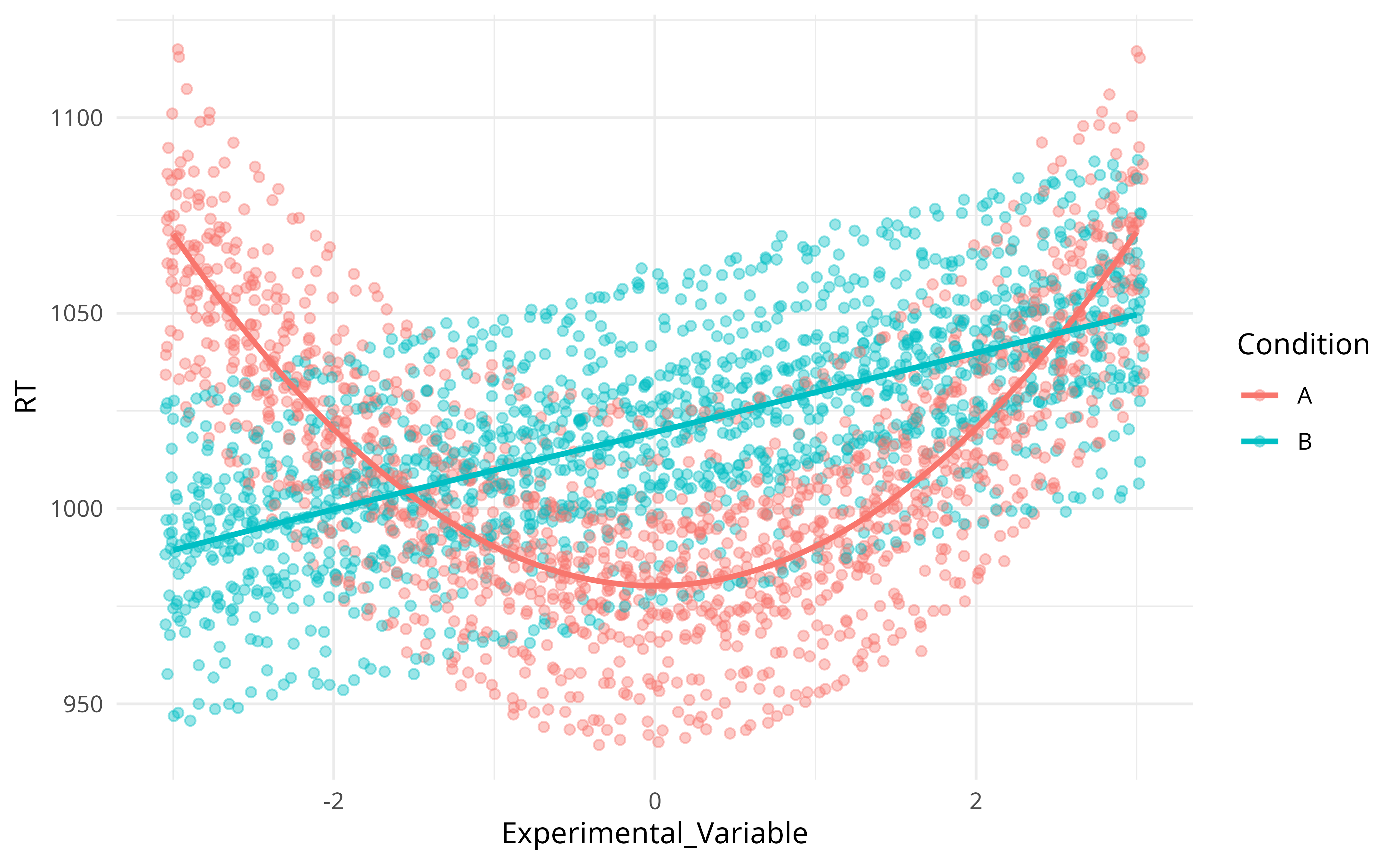 participant$RT <- c(participant$Experimental_Variable[1:(n / 2)]**2 - effect[i], (participant$Experimental_Variable[(n / 2 + 1):n] + effect[i])) + rnorm(n, 0, abs(noise[i]))