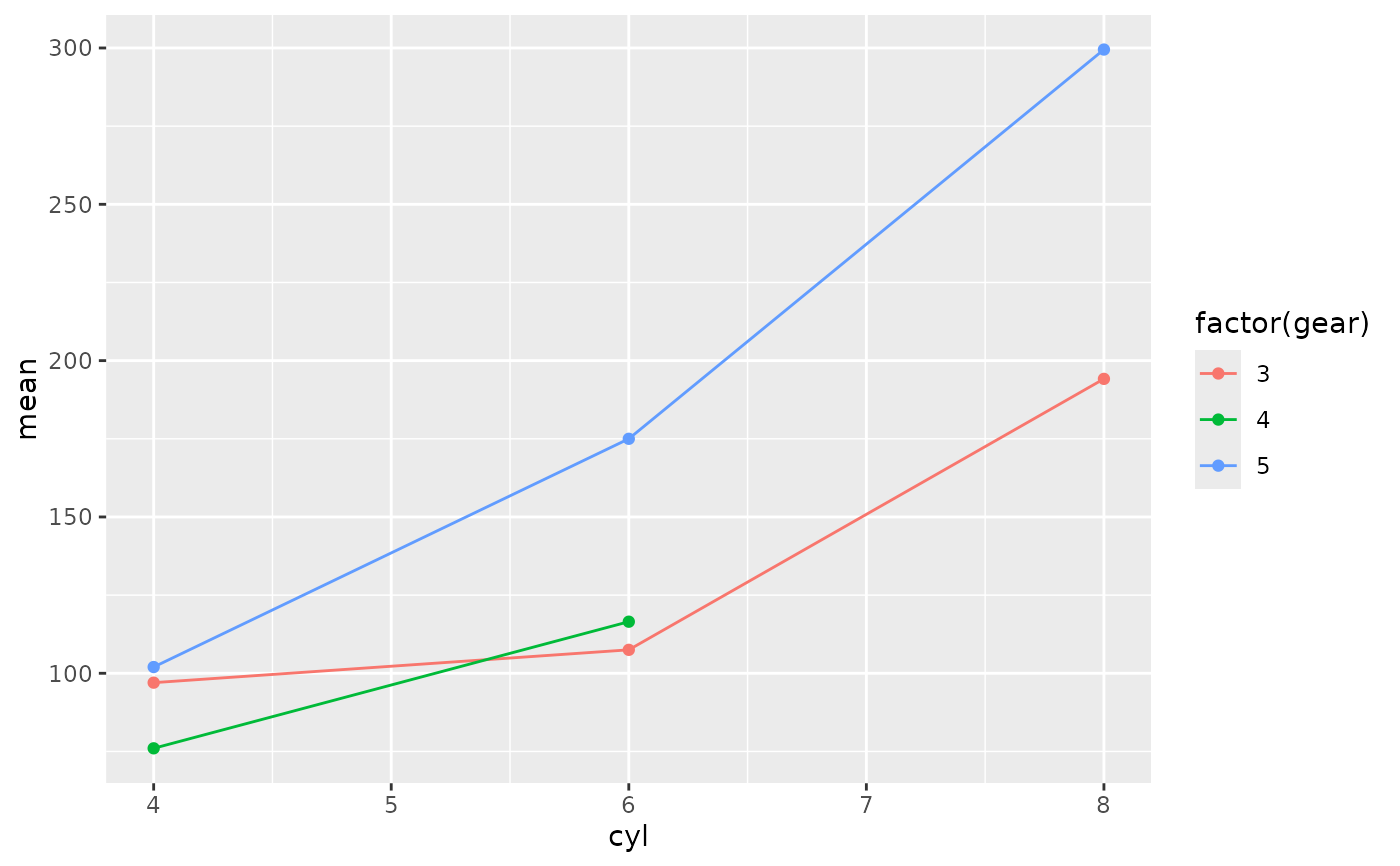 gf_line(mean ~ cyl, color = ~ factor(gear))