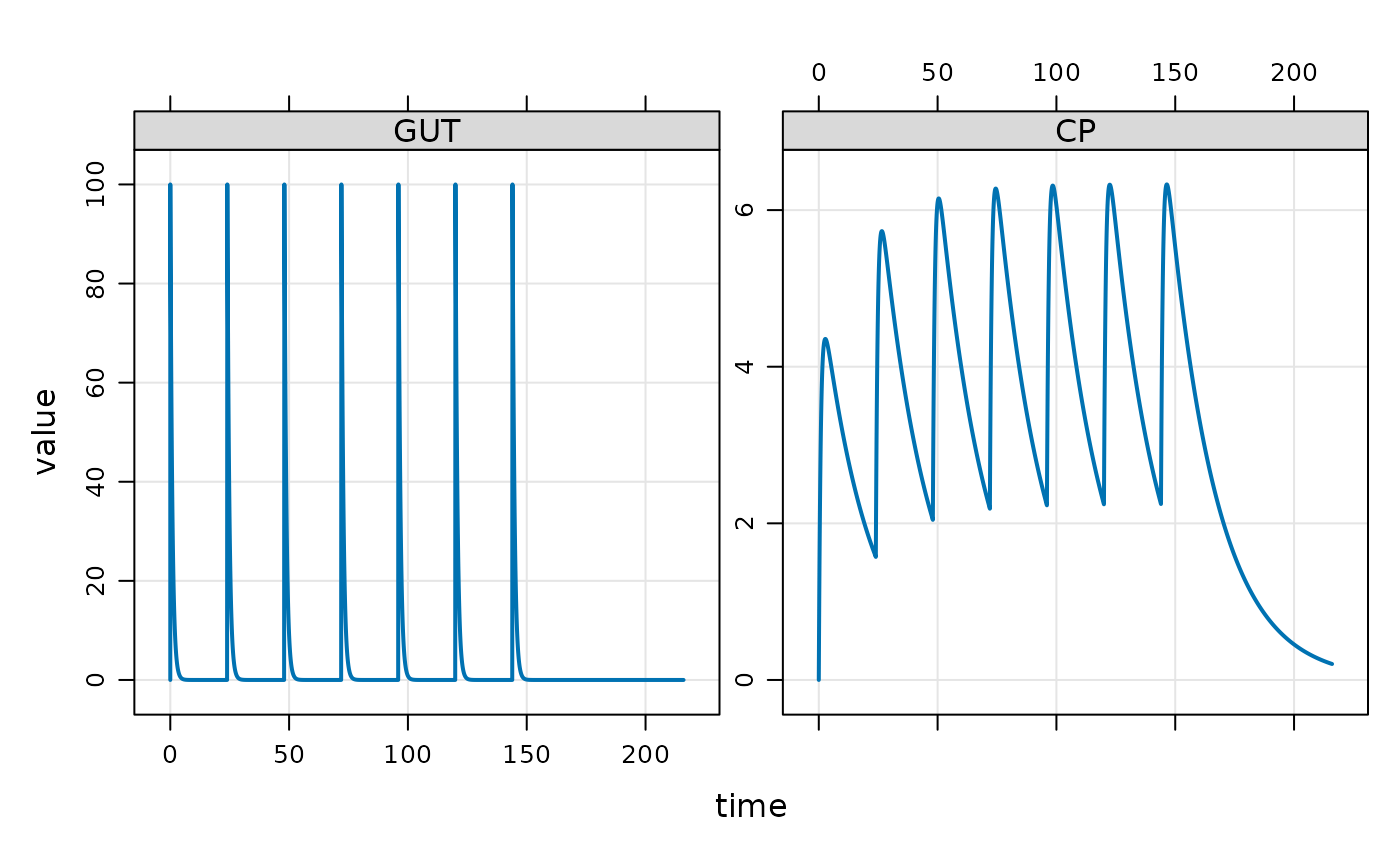 e <- ev(amt = 100, ii = 24, addl = 6)This will implement 100 unit doses every 24 hours for a total of 7