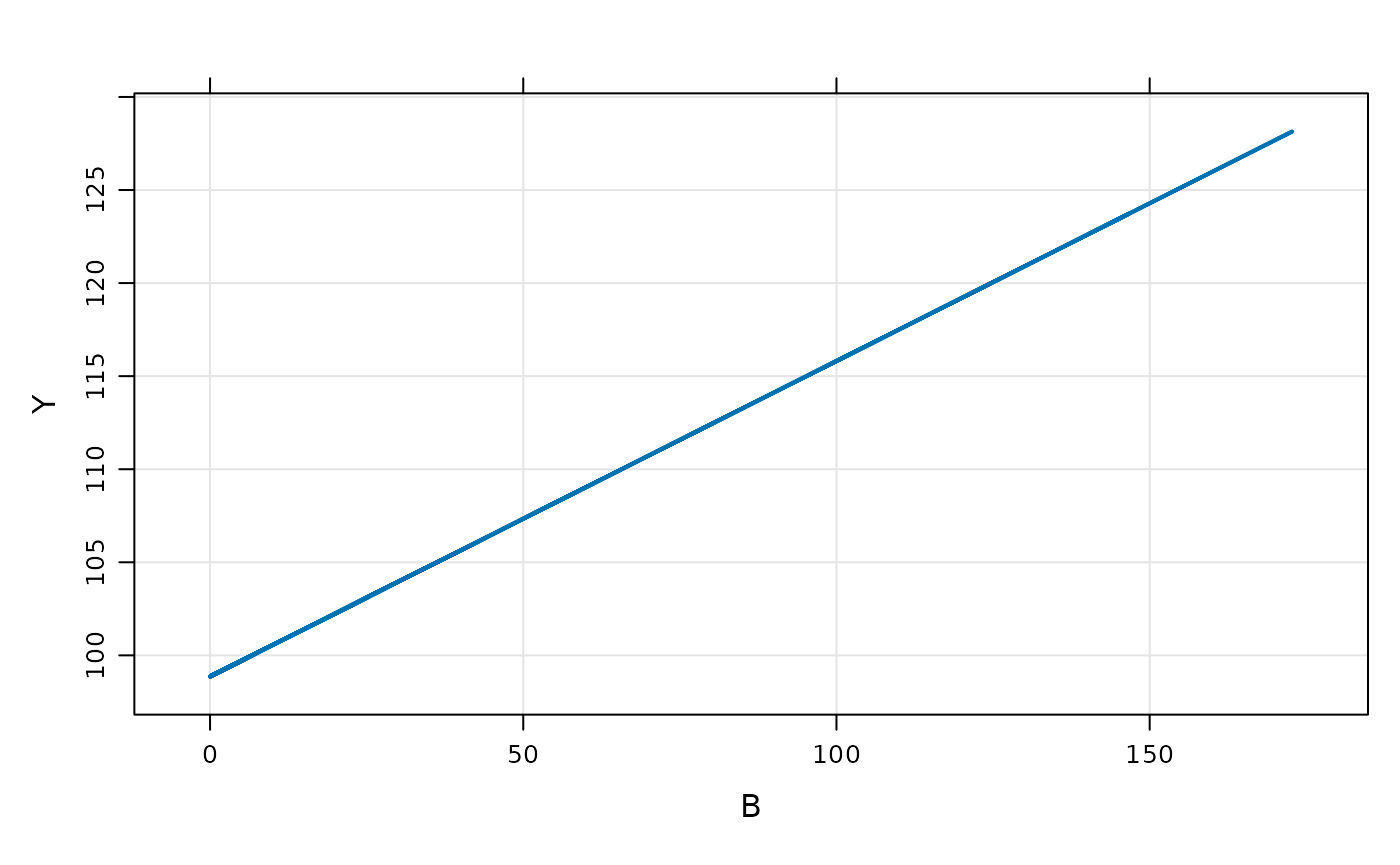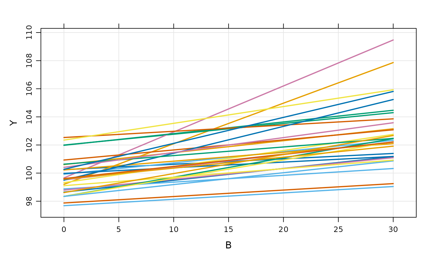 capture Y = beta0i + beta1i*B;This is a random-intercept, random slope linear model. Like other models in mrgsolve, you can write parameters ($PARAM), and random effects ($OMEGA). But the model is actually written in $PRED.
