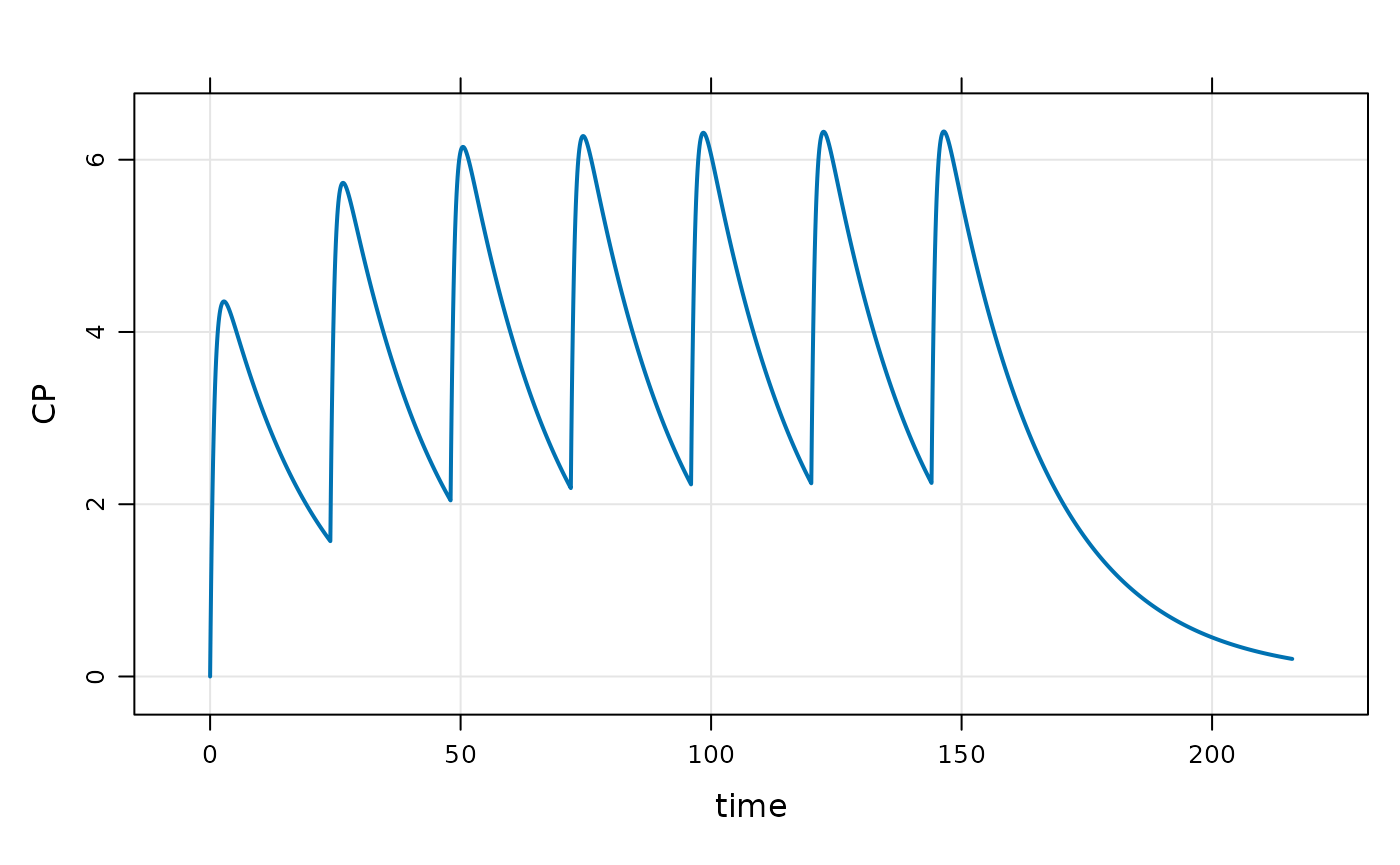 e <- ev(amt = 100, ii = 24, addl = 6)This will implement 100 unit doses every 24 hours for a total of 7 doses. e has class ev, but really it is just a data frame