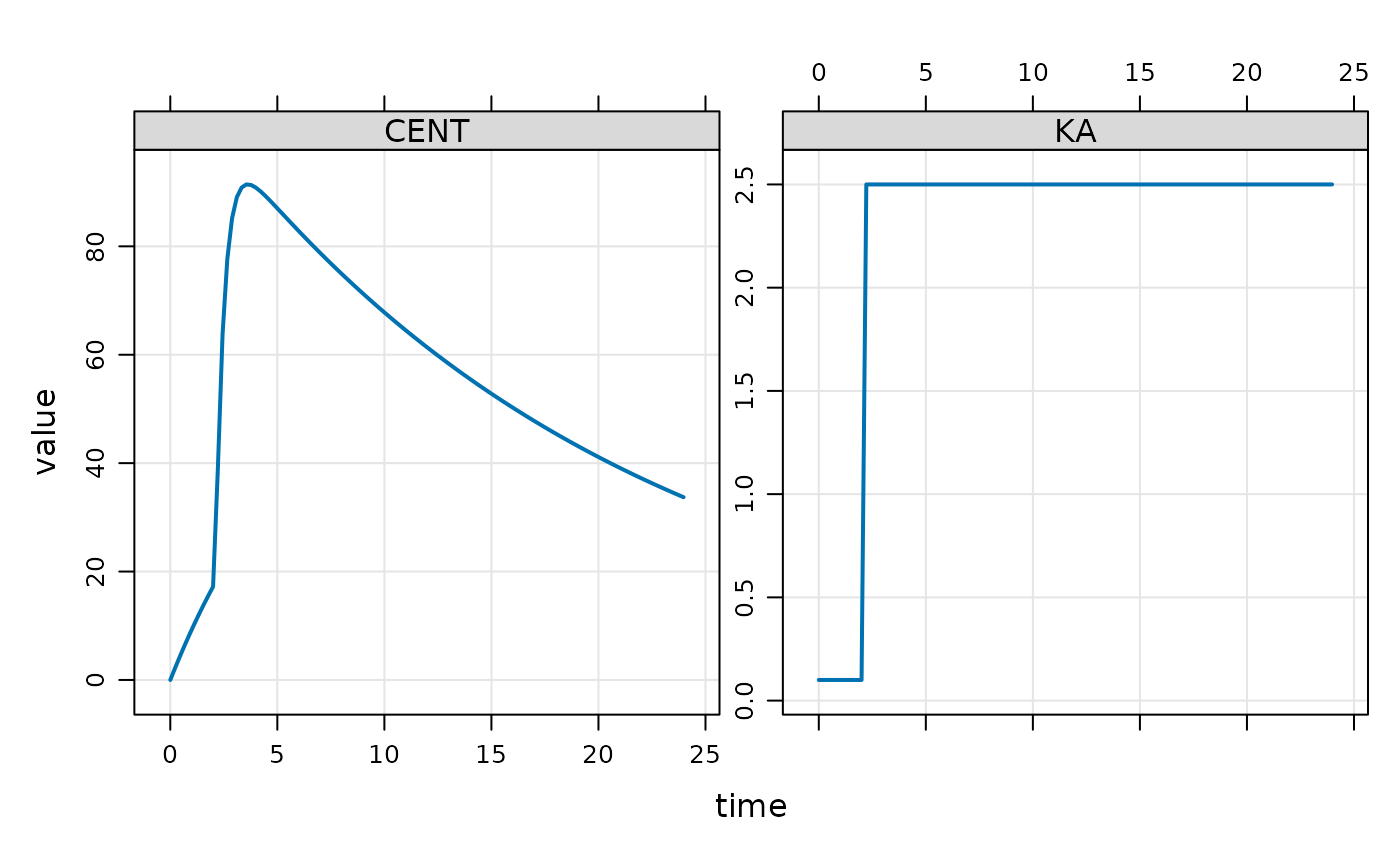 mod %>% ev(amt=100) %>% mrgsim(delta = 0.222) %>% plot(CENT+KA~time)