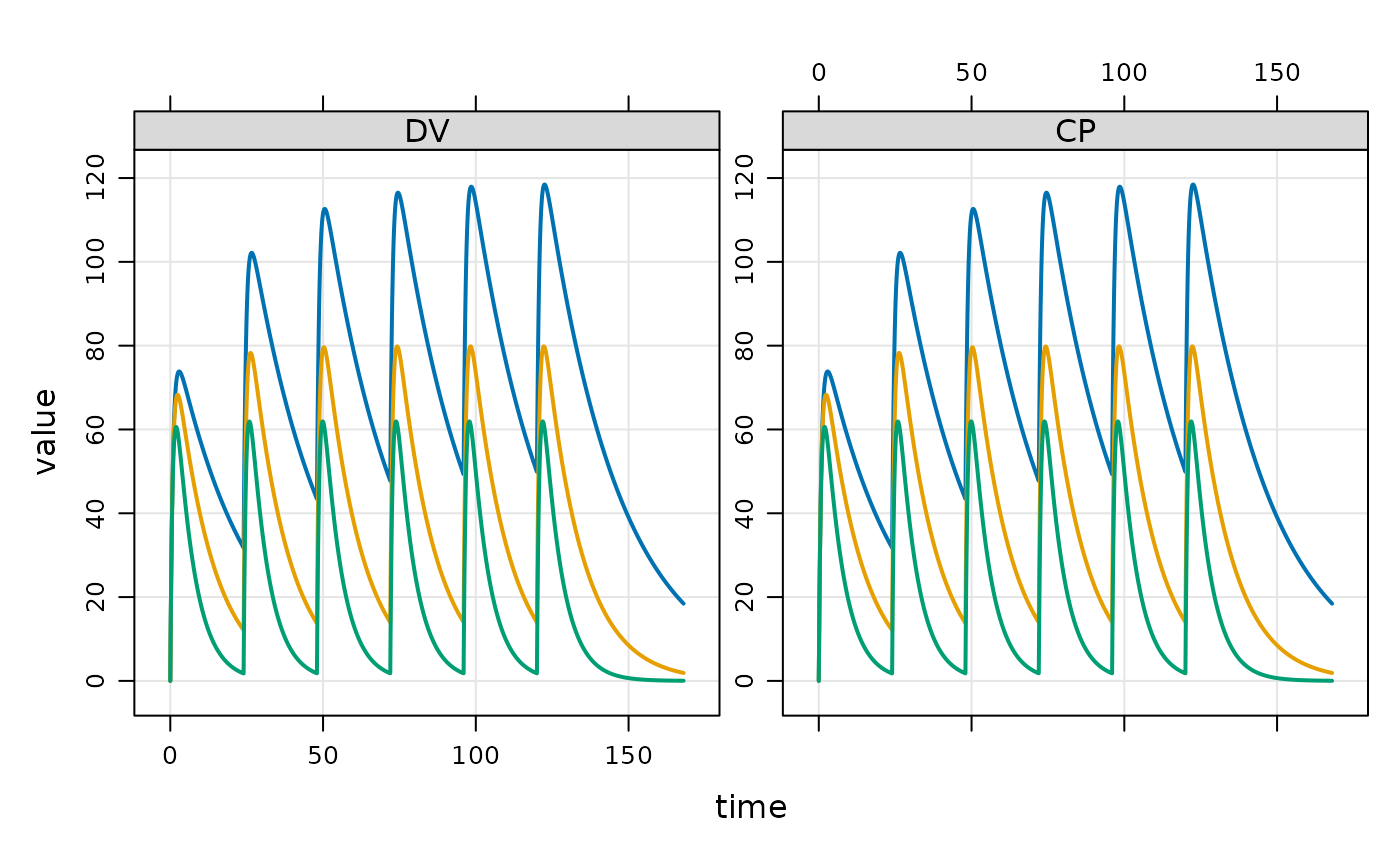 out <- mod %>% ev(events) %>% mrgsim(end=168, idata=idata, req="")