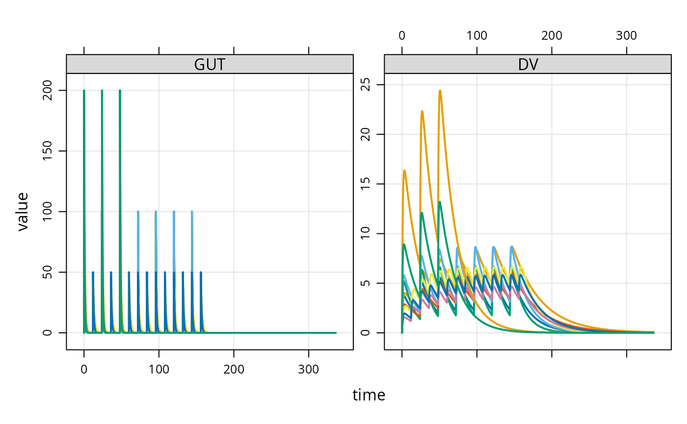e <- ev(amt = 100, ii = 24, addl = 6)This will implement 100 unit doses every 24 hours for a total of 7