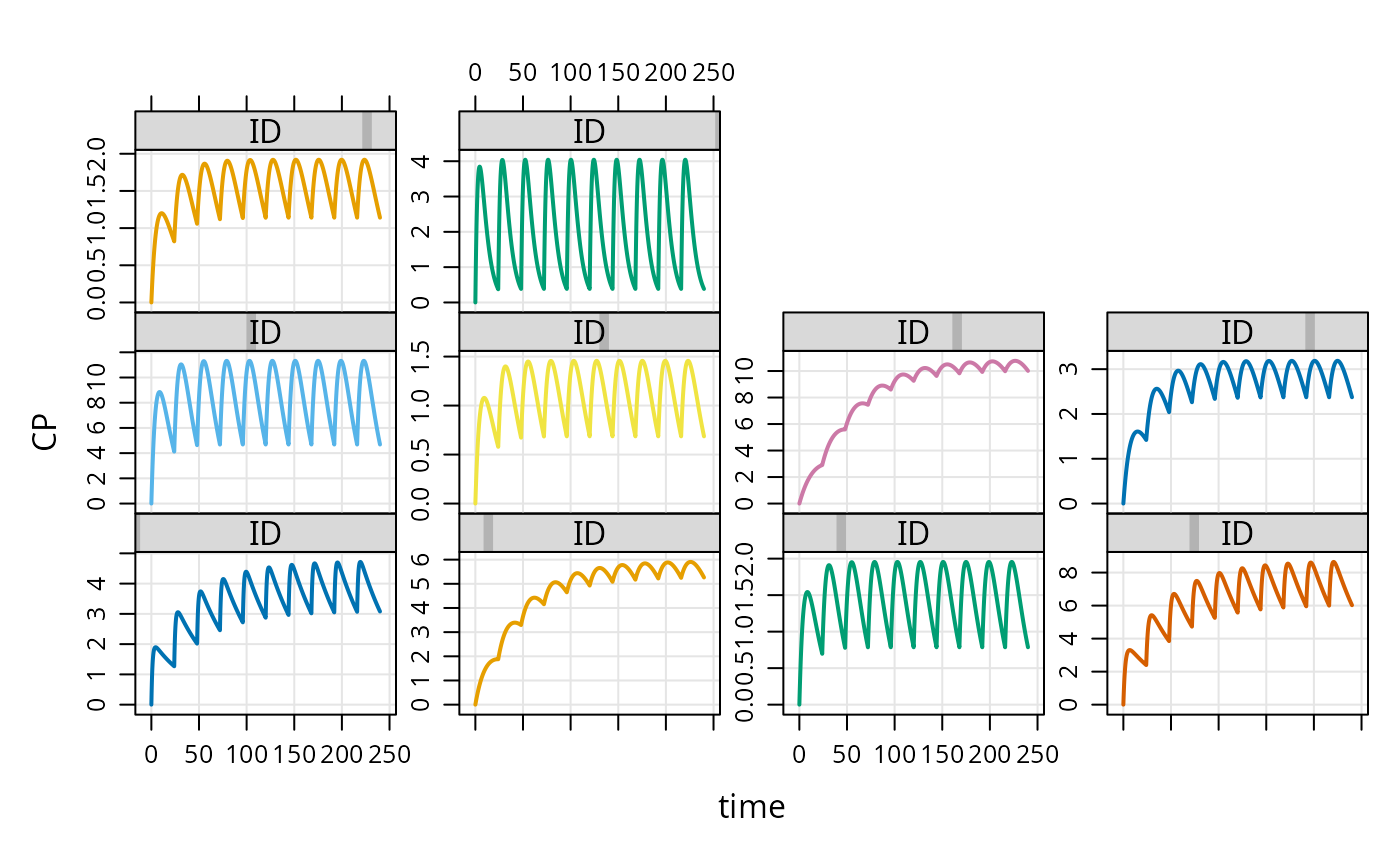 out <- mod %>% idata_set(exidata) %>% ev(amt=100,ii=24,addl=10) %>% mrgsim