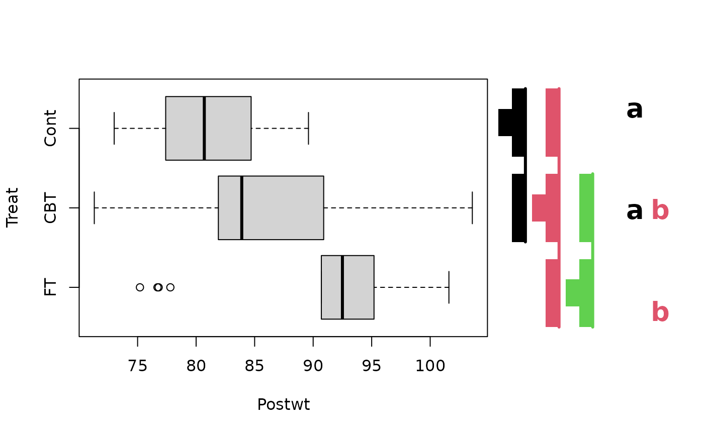 Convert a logical vector or a vector of p-values or a difference or distance matrix into either a letter-based display using "multcompLetters" or a graphic roughly like a "T" using "multcompTs" to identify factor levels or similar groupings that are or are not significantly different. Designed for use in conjunction with the output of functions like TukeyHSD, diststats, simint, simtest, csimint, csimtestmultcomp, friedmanmc, kruskalmcpgirmess.