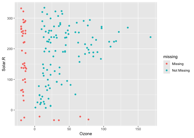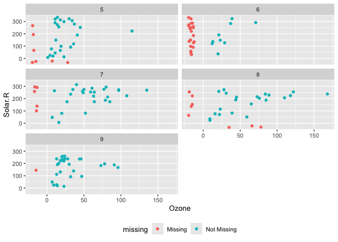 geom_miss_point() has shifted the missing values to now be 10% below the minimum value. The missing values are a different colour so that missingness becomes pre-attentive. As it is a ggplot2 geom, it supports features like faceting and other ggplot features.