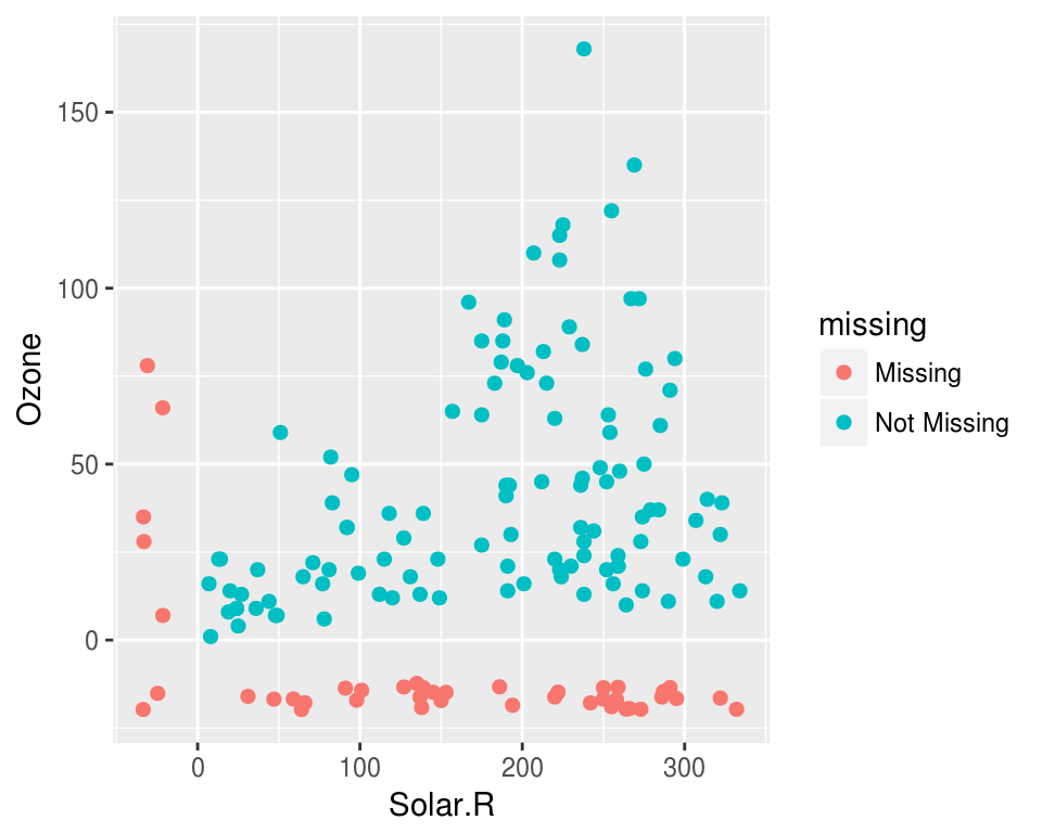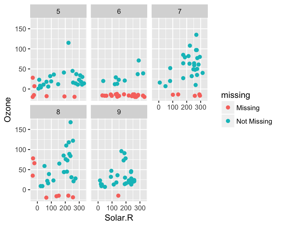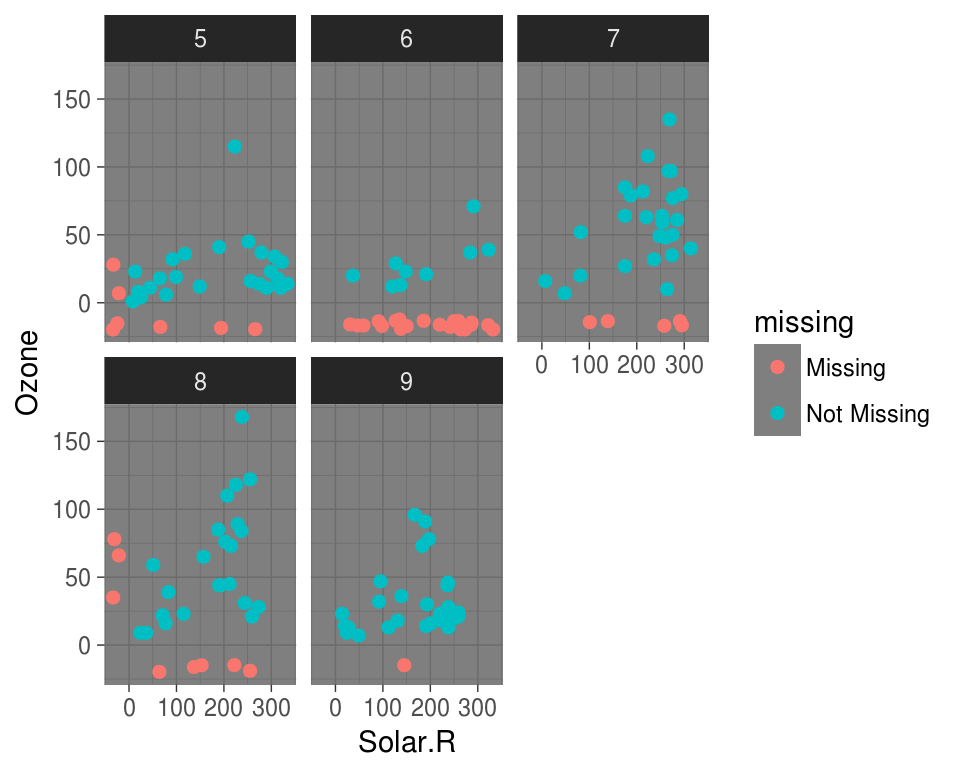 The problem with this is that ggplot does not handle missings be default, and removes the missing values. This makes them hard to explore.